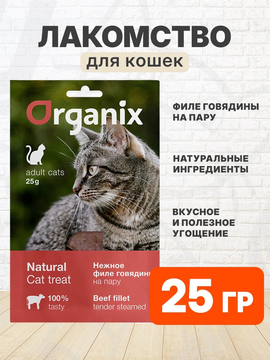 Лакомство ORGANIX для кошек нежное филе говядины, приготовленное на пару. Если Вы хотите не только порадовать своего любимца, но и позаботиться о его здоровом питании, нежное филе говядины, приготовленное на пару - то, что Вы искали! Уникальная рецептура, сохраняющая все полезные качества мяса и неповторимый вкус без добавок и консервантов!