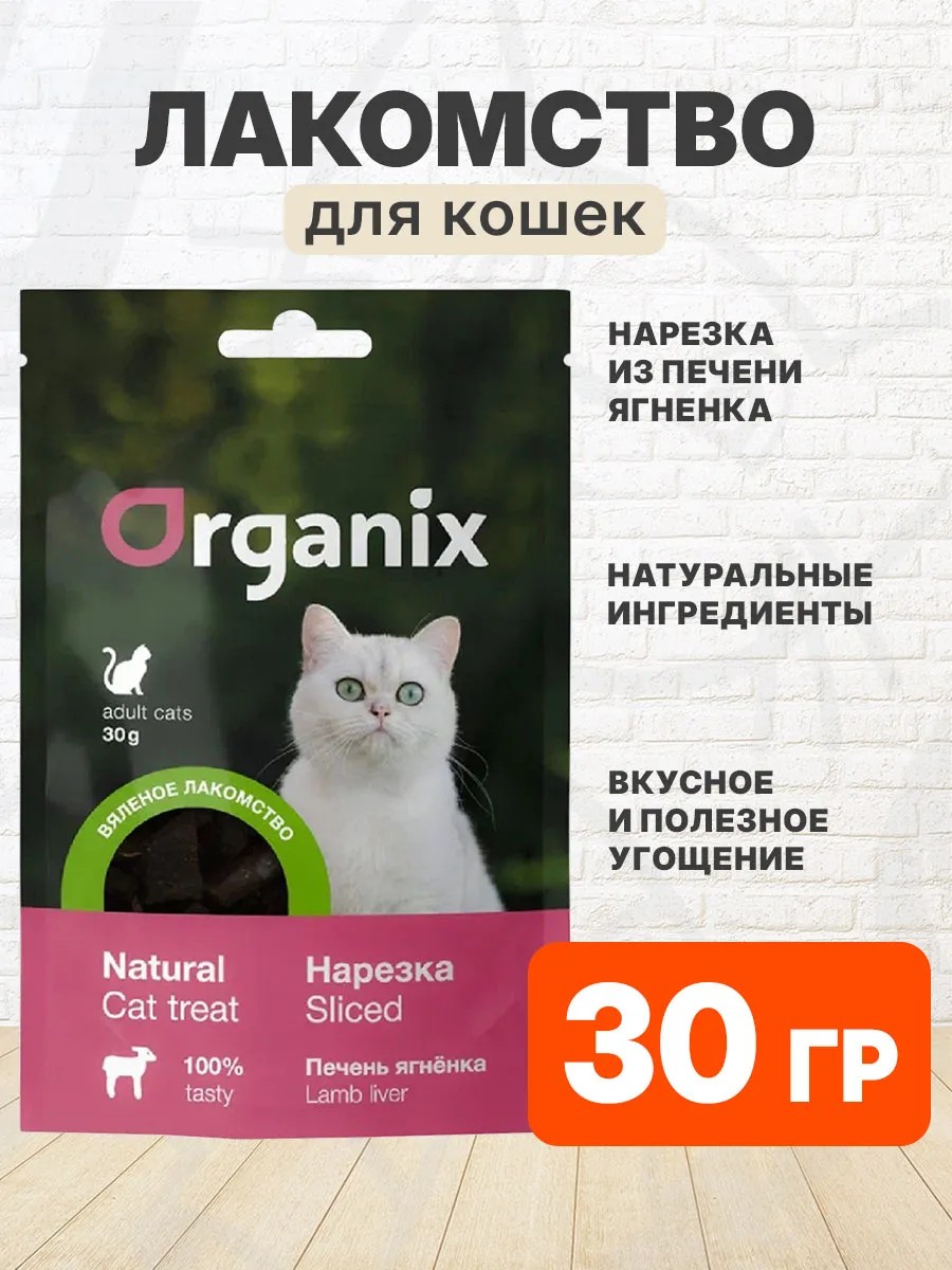 Лакомство ORGANIX вяленое для кошек нарезка из печени ягненка 30 гр. Нарезка из печени ягненка - натуральное, вкусное и полезное лакомство для взрослых кошек.