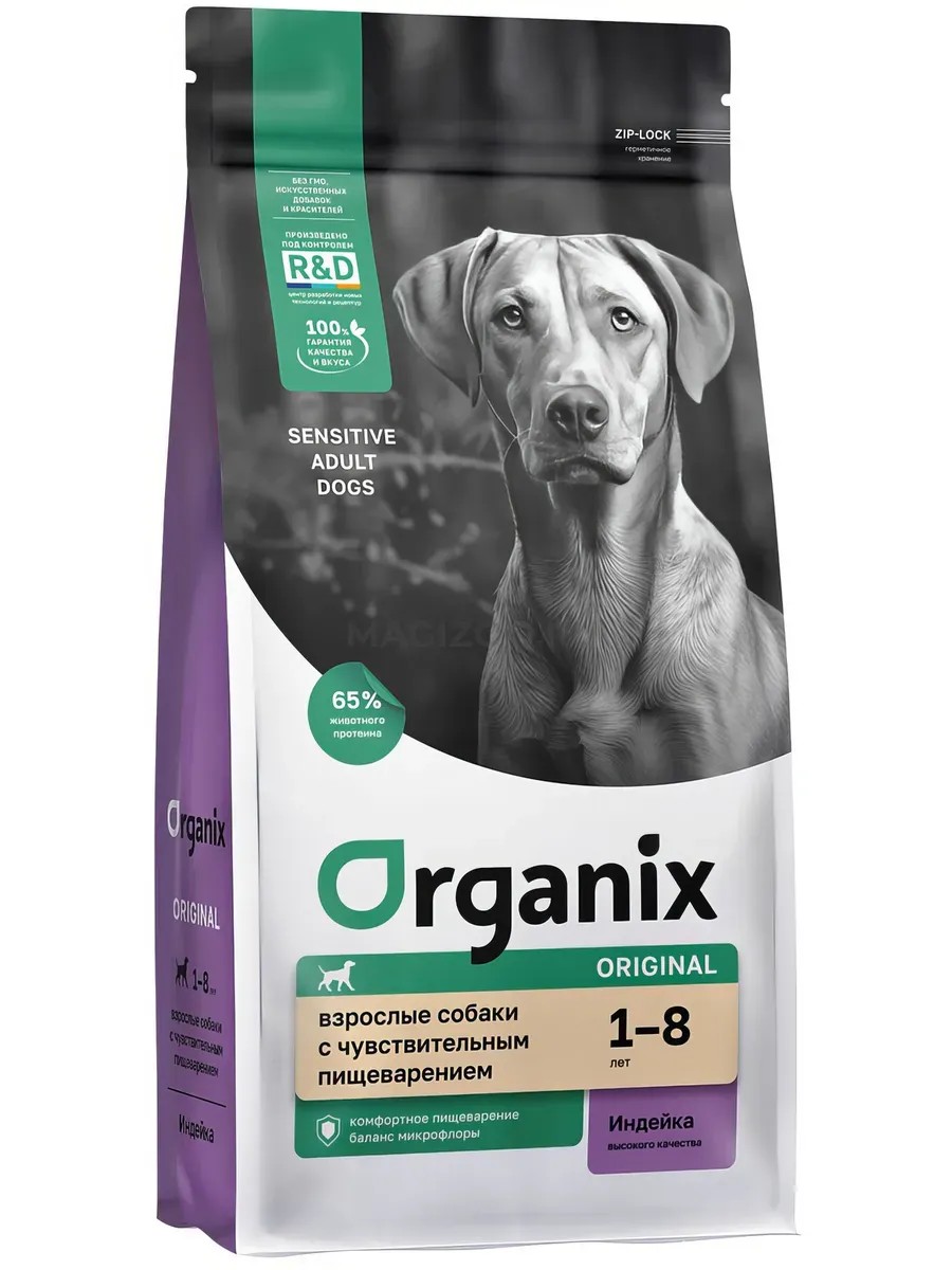 Organix Adult Dog Turkey Food for Dogs with Sensitive Digestion, with Turkey, 3 kg. Organix Adult Dog Turkey Food for Dogs with Sensitive Digestion, with Turkey, 3 kg New design and improved packaging: ZIP-Lock for airtight storage and maintaining food freshness. Updated composition: more meat and meat ingredients, additional natural sources of vitamins and minerals for the proper development and strengthening of the body's defenses. Our professional nutritionists and technologists have developed a special formula for dogs with sensitive digestion or prone to allergic reactions. The food ensures a balance of intestinal microflora and improves gastrointestinal tract function: a balanced complex of vitamins and minerals helps strengthen the immune system; easily digestible proteins ensure comfortable digestion; brewer's yeast, salmon oil and flax seeds care for the beauty and health of the coat; L-carnitine increases the dog's endurance during physical activity and helps maintain optimal weight; Inulin normalizes intestinal microflora; lecithin supports liver health. Free of GMOs, soy, wheat, artificial colors, and preservatives. Monitor your dog's diet and do not overfeed, provide access to fresh water. Feeding recommendations depending on your pet's daily activity (new composition): Feeding recommendations (old composition): These amounts are approximate. Daily nutritional requirements may vary depending on the age, breed, build, activity level, and living conditions of the animal. For your dog's health, consult your veterinarian regularly.
