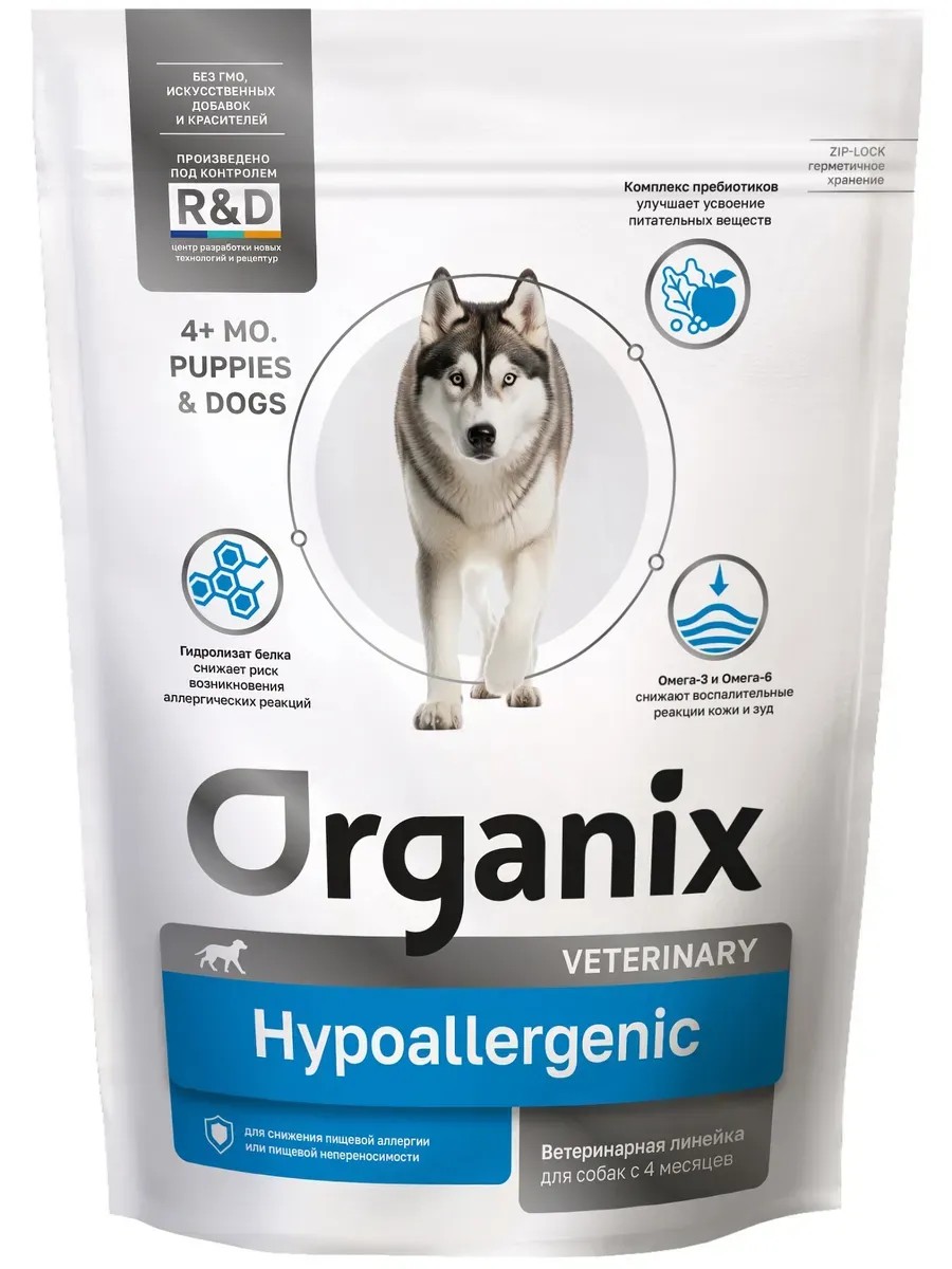 Корм OrganixHypoallergenic для щенков и собак, при пищевой аллергии, 800 г. Корм Organix Hypoallergenic для щенков и собак, при пищевой аллергии, 800 г Organix Veterinary - линейка диетических кормов для кошек и собак, разработанная ветеринарными врачами и нутрициологами с учётом особых потребностей животных, имеющих различные проблемы со здоровьем. Лечебные диеты Organix Veterinary изготовлены из ингредиентов высокого качества, легко усваиваются и не содержат искусственных добавок и красителей. Корма производятся под контролем R D-центра, собственной лаборатории и специалистов с международным опытом. Особое внимание уделяется контролю за состоянием питомцев, который подтверждает эффективность и пользу производимой продукции. Наши профессиональные нутрициологи и ветеринарные врачи разработали специальную формулу корма для снижения пищевой аллергии или пищевой непереносимости. Полнорационный сухой корм Organix Veterinary Hypoallergenic - это диетическое питание для собак для снижения пищевой непереносимости ингредиентов и питательных веществ. Особенности: использование гидролизованного белка с низкой молекулярной массой помогает снизить риск аллергических реакций; высокая концентрация незаменимых жирных кислот (линолевая кислота, эйкозапентаеновая кислота (EPA) и докозагексаеновая кислота (DHA) ) способствует максимальному усилению естественных противовоспалительных процессов; цинк и витамин Е способствуют защите клеток от повреждения и регенерации тканей; тщательно отобранные источники углеводов помогают минимизировать возможность проявления аллергических реакций; комплекс пребиотиков улучшает усвоение питательных веществ и укрепляет иммунную систему. Противопоказания: панкреатит; беременность; период лактации. Размер гранул: 10-12 мм; толщина: 6-7 мм. Одобрено ветеринарными врачами. Organix - профессиональная забота о питомцах! Рекомендации по кормлению: Для взрослых собак и щенков с 4 месяцев. Перед применением проконсультируйтесь с ветеринарным врачом