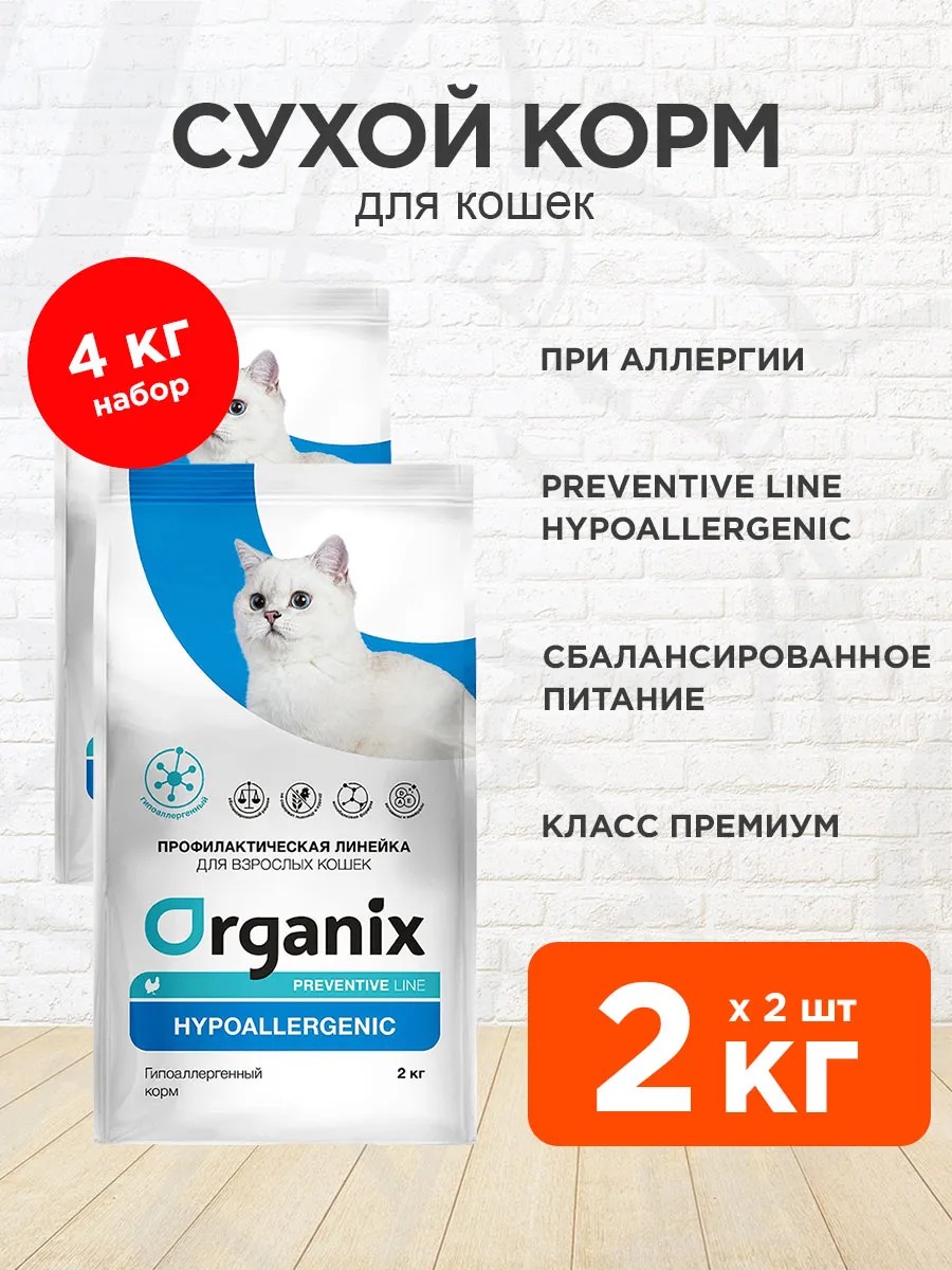 Полнорационный сбалансированный сухой корм для кота Organix Hypoallergenic это диетический корм, предназначенный для снижения риска пищевой аллергии у питомца.