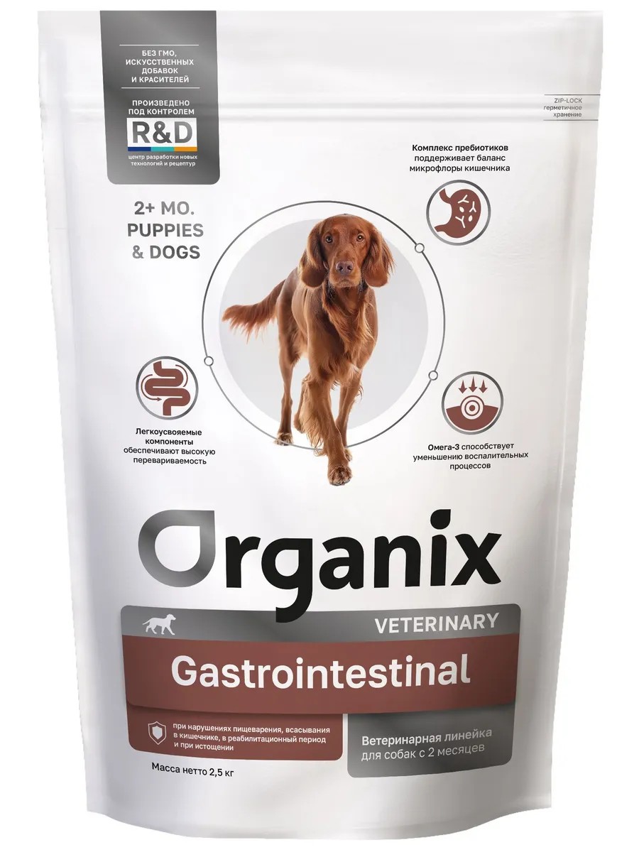| Полное наименование товара | Organix Veterinary сухой корм для собак GASTROINTESTINAL при нарушениях пищеварения, в реабилитационный период и при истощении 2,5 кг |