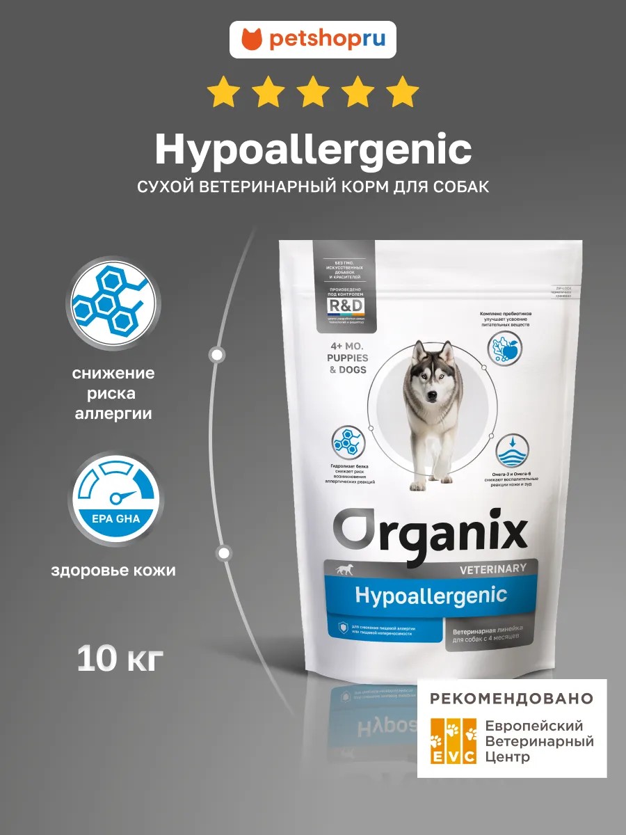 Полнорационный сухой корм Organix Veterinary Hypoallergenic - это диетическое питание для собак для снижения пищевой непереносимости ингредиентов и питательных веществ.