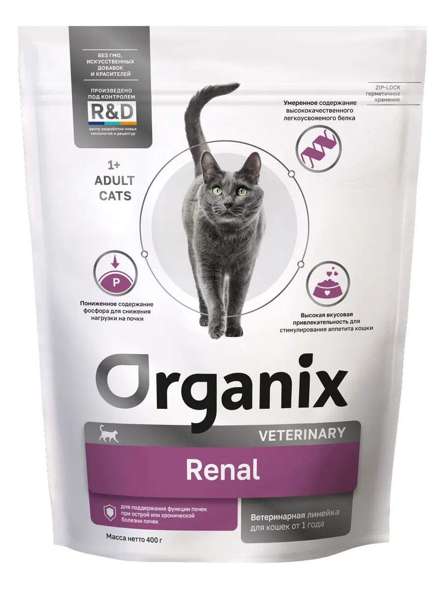 | Полное наименование товара | Organix Cat Veterinary сухой корм для взрослых кошек RENAL для поддержания функции почек при острой или хронической болезни почек 400 г |