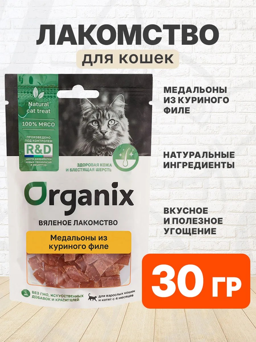 Лакомство ORGANIX вяленое для кошек медальоны из куриного филе 30 гр. Медальоны из куриного филе - натуральное, вкусное и полезное лакомство для взрослых кошек.