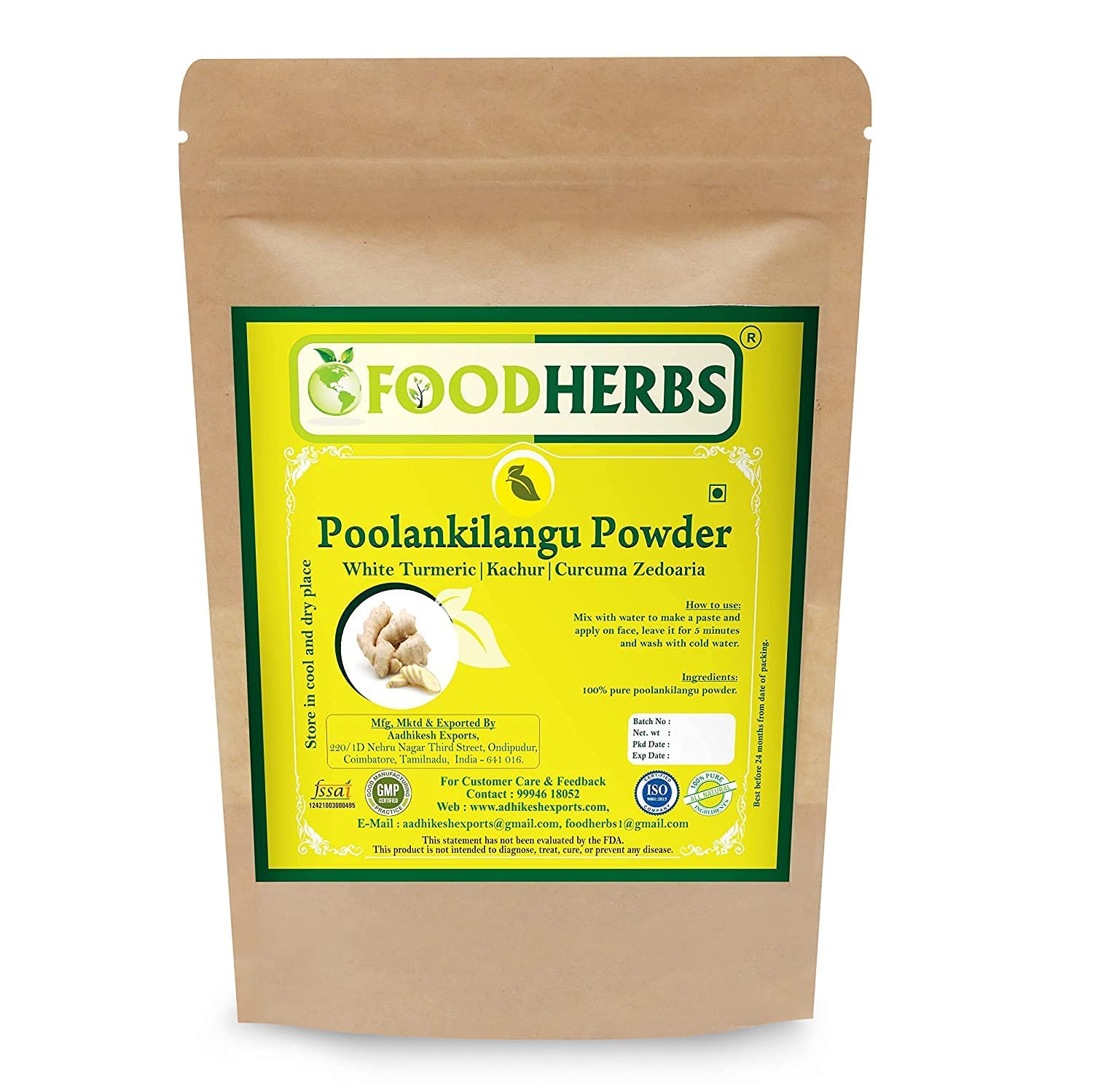 The botanical name of white turmeric is Curcuma Zeodaria. It is also called Kappor kachri, Poolankilangu and Kachur. The rhizomes are cut, dried and pulverized for powdering. It possesses all the great benefits of turmeric powder. The white turmeric is preferred because it does not stain the skin like the wild turmeric. Make a paste with water and the white turmeric powder. Simply apply it to the hair from the roots to the tips of the hair and leave it on for 25 minutes and then rinse it out. For more hydration of the hair, you can also add aloe vera, honey. INSTRUCTIONS FOR USE Make a paste with water and the white turmeric powder. Simply apply it to the hair from the roots to the tips of the hair and leave it on for 25 minutes and then rinse it out. For more hydration of the hair, you can also add aloe vera, honey.AOZA Foodherbs Poolankilangu Kachur Wit Kurkuma Poeder 200 gm De botanische naam van witte kurkuma is Curcuma Zeodaria. Het wordt ook wel Kappor kachri, Poolankilangu en Kachur genoemd. De wortelstokken worden gesneden, gedroogd en verpulverd voor poedering. Het bezit alle grote voordelen van kurkumapoeder. De witte kurkuma heeft de voorkeur omdat het de huid niet bevlekt zoals de wilde kurkuma. Maak een pasta met water en het witte kurkumapoeder. Breng het gewoon aan op het haar van de wortels tot de toppen van het haar en laat het 25 minuten intrekken en spoel het daarna uit. Voor meer hydratatie van het haar, kunt u ook aloë vera, honing toevoegen. GEBRUIKSAANWIJZING Maak een pasta met water en het witte kurkumapoeder. Breng het gewoon aan op het haar van de wortels tot de toppen van het haar en laat het 25 minuten intrekken en spoel het daarna uit. Voor meer hydratatie van het haar, kunt u ook aloë vera, honing toevoegen.
