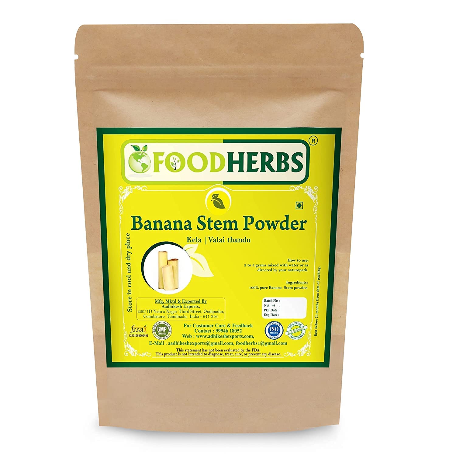 Banana stem vazhaithandu plantain stem has many health benefits. Banana stem has diuretic properties and helps detoxify the body. Banana stem is packed with fiber and including it in a weight loss plan will yield faster results. Drinking a cup of banana stem juice helps in treating hyperacidity. It can also be taken on an empty stomach. Since plantain stem is full of fiber, it will greatly help people who are constipated.Easy to use. Premium quality. no chemical pesticides, artificial additives or preservatives. Can help with kidney stones.Foodherbs Banaan Stam Poeder 100 gm Vazhaithandu Bananenstam vazhaithandu weegbree-stam heeft veel gezondheidsvoordelen. Bananenstengel heeft diuretische eigenschappen en helpt het lichaam te ontgiften. Bananenstengel zit vol met vezels en het opnemen in een plan voor gewichtsverlies zal snellere resultaten opleveren. Het drinken van een kopje bananenstengelsap helpt bij de behandeling van hyperaciditeit. Het kan ook op een lege maag worden ingenomen. Omdat weegbree-stengel vol vezels zit, zal het mensen die verstopt zijn enorm helpen.Makkelijk te gebruiken. Premium kwaliteit. geen chemische bestrijdingsmiddelen, kunstmatige toevoegingen of conserveermiddelen. Kan helpen met nierstenen.