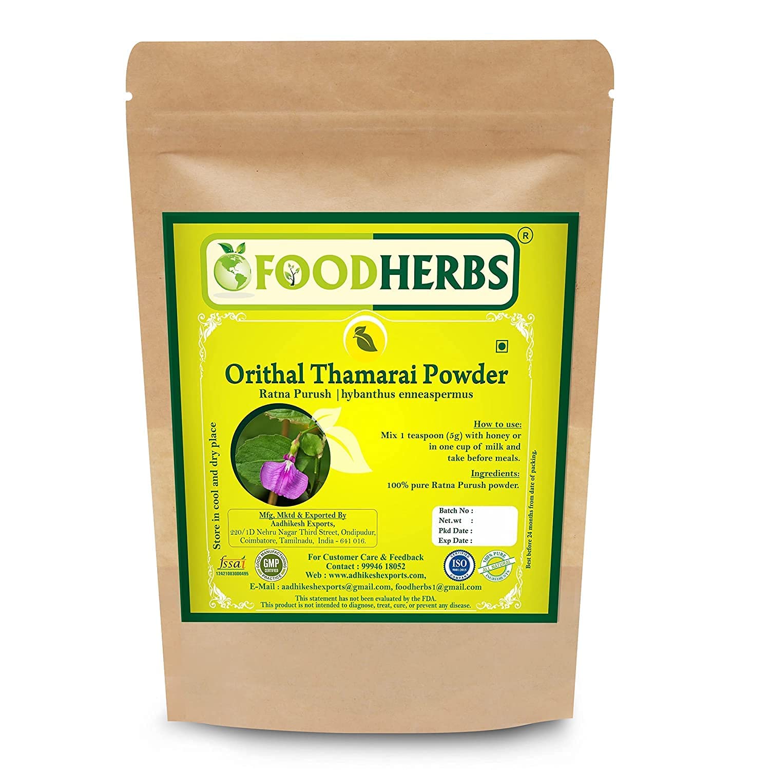 ORGANIZE Foodkruiden Ratna Purush PoederHybanthus EnneaspermusOrithal Thamarai 100 gm