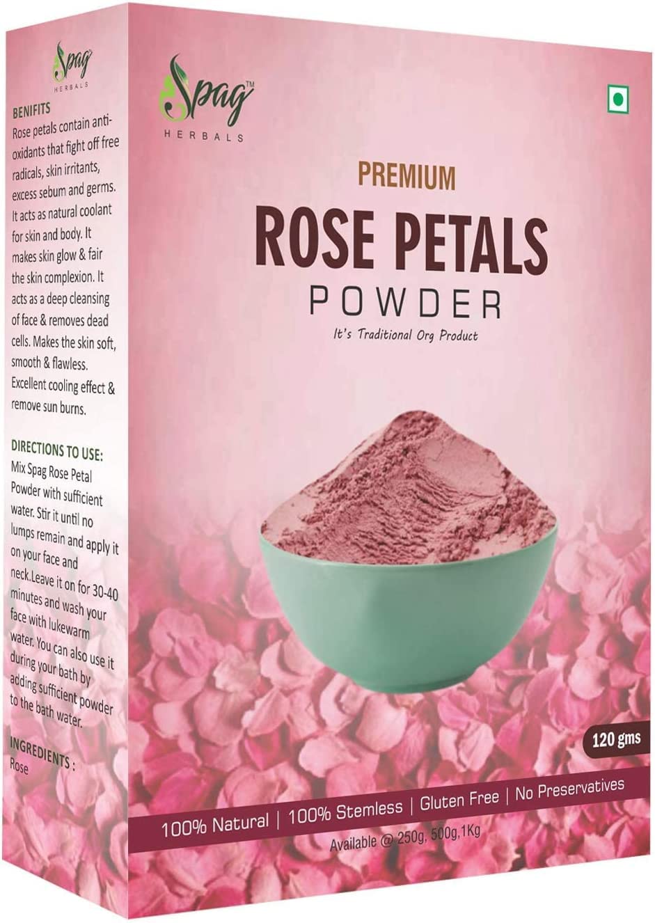 Rose petals contain antioxidants that fight free radicals, skin irritants, excess sebum and germs. It acts as a natural coolant for the skin and body. It makes the skin glow and soften the skin complexion. It acts as a deep cleanser for the face and removes dead cells. Makes the skin soft, smooth and flawless. Excellent cooling effect remove sunburns. Directions To use Mix Spag Rose Petal Powder with enough water. Stir it until no lumps remain and apply it to your face and neck. Leave it on for 30-40 minutes and wash your face with lukewarm water. You can also use it during your bath by adding enough powder to the bath water.makes the skin glow and soften the skin complexion. antioxidants that fight free radicals, skin irritants, excess sebum and germs. Easy to use. Organic 100 Natural and effective herbal product.Spag Herbals Premium Biologische Rozenblaadjes Poeder 120g Rozenblaadjes bevatten anti-oxidanten die vrije radicalen, huidirriterende stoffen, overtollig talg en ziektekiemen bestrijden. Het werkt als natuurlijk koelmiddel voor huid en lichaam. Het maakt de huid gloeien en de huidteint verzachten. Het werkt Rose als een diepe reiniging van het gezicht en verwijdert dode cellen. Maakt de huid zacht, glad en vlekkeloos. Uitstekend koeleffect verwijder zonnebrandwonden. Route Om Mix Spag Rose Petal Powder met voldoende water te gebruiken. Roer het tot er geen klontjes overblijven en breng het aan op je gezicht en nek. Laat het 30-40 minuten intrekken en was je gezicht met lauw water. Je kunt het ook tijdens je bad gebruiken door voldoende poeder aan het badwater toe te voegen.maakt de huid gloeien en de huidteint verzachten. anti-oxidanten die vrije radicalen, huidirriterende stoffen, overtollig talg en ziektekiemen bestrijden. Makkelijk te gebruiken. Biologisch 100 Natuurlijk en effectief kruidenproduct.