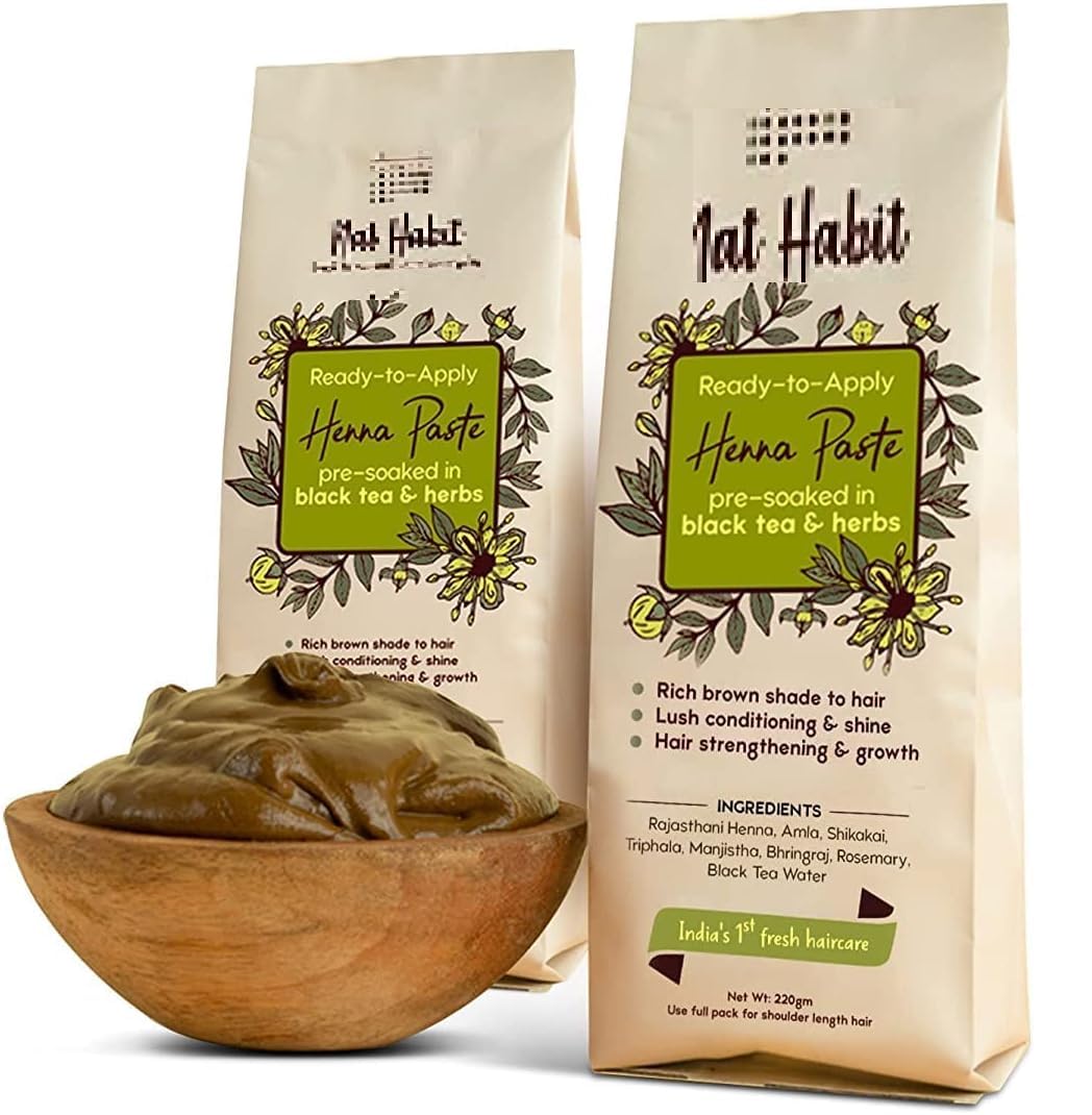 INSTRUCTIONS FOR USE Pour Henna paste into a bowl and stir. Apply evenly to hair and roots. Cover with hair foil to prevent drying and staining. After 2-3 hours wash with plain water. Do not use shampoo. Can use conditioner to wash. Or, can use oil after hair dries. The next day you can use shampoo to wash again. Use a full pack for shoulder length hair. Use the second pack for longer hair. Store airtight in the refrigerator. Use within 45 days of Mfd. If stored in the freezer, can use Mfd for up to 90 days. Thaw before use.FRESHLY MADE in AYURVEDIC KITCHEN, DAILY: Freshly prepared every day, immediately AFTER ORDER. AYURVEDIC INGREDIENTS are administered for maximum results. Certified as Ayurvedic medicine by the government. from AYUSH. 100 CHEMICAL FREE, PRESERVATION FREE, ALCOHOL FREE. Simply Pure Fresh Henna - nature's safest color. RAJASTHANI ULTRA-FILTERED HENNA, SOAKED in black tea and herbs: No chemicals, no dye - just pure Rajasthani Ultra-Filtered henna, soaked in black tea and herbs and prepared to give hair a rich dark brown color. RICH BROWN SHADE: Gives hair a rich brown shade. Color lasts longer than normal Henna powder. RICH HAIR CARE CONDITIONING: Lush conditioning and shine. Strengthens the hair and helps with hair growth. Ready to Apply Henna Paste: Ready to apply whenever you want. Doesn't need any pre-planning.Verem NAT Habit - Back to Natural Secrets Everyday kant-en-klare henna-pasta, 220 g - donkerbruin (Pack van 2) GEBRUIKSAANWIJZING Giet Henna pasta in een kom en roer. Gelijkmatig aanbrengen op haar en wortels. Dek af met haarfolie om uitdroging en vlekken te voorkomen. Na 2-3 uur wassen met gewoon water. Gebruik geen shampoo. Kan conditioner gebruiken om te wassen. Of, kan olie gebruiken nadat het haar droogt. De volgende dag kunt u shampoo gebruiken om opnieuw te wassen. Gebruik een volledige verpakking voor schouderlang haar. Gebruik de tweede verpakking voor langer haar. Luchtdicht bewaren in de koelkast. Gebruik binnen 45 dagen na Mfd. Indien opgeslagen in de vriezer, kan tot 90 dagen Mfd gebruiken. Ontdooi voor gebruik.VERS GEMAAKT in AYURVEDISCHE KEUKEN, DAGELIJKS: Elke dag vers bereid, direct NA BESTELLING. AYURVEDISCHE INGREDIËNTEN worden toegediend voor maximale resultaten. Gecertificeerd als Ayurvedische geneeskunde door de regering. van AYUSH. 100 CHEMISCH VRIJ, CONSERVEERVRIJ, ALCOHOL VRIJ. Simply Pure Fresh Henna - de veiligste kleur van de natuur. RAJASTHANI ULTRA-FILTERED HENNA, GEweekt in zwarte thee en kruiden: Geen chemicaliën, geen kleurstof - alleen pure Rajasthani Ultra-Filtered henna, gedrenkt in zwarte thee en kruiden en bereid om het haar een rijke donkerbruine kleur te geven. RIJKE BRUINE SCHAD: Geeft het haar een rijke bruine tint. Kleur gaat langer mee dan normaal Henna-poeder. RIJKE HAARVERZORGING CONDITIONING: Weelderige conditionering en glans. Versterkt het haar en helpt bij de haargroei. Klaar om hennapasta aan te brengen: klaar om aan te brengen, wanneer je maar wilt. Heeft geen pre-planning nodig.