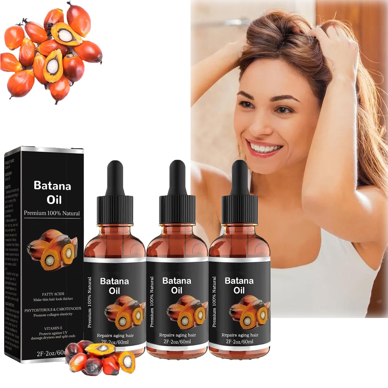 Features: 1. It contains no harmful chemicals and is safe and effective for all hair types. 2. Batana Oil for Hair Growth: Our unique method is designed to nourish your hair from root to tip, promoting healthy growth and preventing damage. 3. Improves Hair: Batana oil can improve hair health and enhance shine, giving you a natural, youthful glow. How to Use: Apply batana oil to damp or dry hair, focusing on the ends to increase moisture, or use it as a conditioner to boost shine. Specifications: Product Name: 100 Organic Batana Oil Ingredients: Batana Oil Net Weight: 60 ml Storage Method: Store in a cool, dark place. Contents: 1 2 3 5 pieces of 100 organic batana oil. Note: 1. Due to differences in display and lighting, please refer to the actual product received. 2. Please allow for a 1-2 cm difference in size due to manual measurement. Directions for Use: Apply Batana oil to damp or dry hair, focusing on the ends to increase moisture, or use it as a conditioner to enhance shine. Safety Warning: None See moreSuitable for Everyone With its lightweight formula and pleasant fragrance, Batana Oil easily integrates into your daily hair care routine. It's suitable for all hair types and makes a thoughtful and versatile gift for everyone. Batana Oil for Hair Growth: Our unique formula is designed to nourish your hair from root to tip, promoting healthy growth and preventing damage. Improve Hair Batana Oil not only improves the health of your hair but also enhances your skin's radiance, giving you a natural, youthful glow. Our unique formula nourishes your hair from root to tip, stimulates healthy hair growth, and prevents damage. How to Use: Apply Batana Oil to damp or dry hair, focusing on the ends for extra hydration, or use it as a conditioning treatment for added shine. 100 Organic Batana Oil: Batana Oil is a miracle in a bottle. This 100 natural Honduran oil is cold-pressed and free of harmful chemicals, making it safe and effective for all hair types.Lot de 3 huiles de batana bio pour la croissance des cheveux - Huile de batana bio Rosemary Organic Natural Hair Growth Oil - Favorise le bien-être des cheveux chez les hommes et 3 pièces.DESCRIPTION DU PRODUIT DESCRIPTION DU PRODUIT Caractéristiques : 1. Elle ne contient pas de produits chimiques nocifs et est sûre et efficace pour tous les types de cheveux. 2. Huile de Batana pour la croissance des cheveux : notre méthode unique est conçue pour nourrir vos cheveux du bas aux pointes, favoriser une croissance saine et éviter les dommages. 3. Améliore les cheveux, l'huile de batana peut améliorer la santé des cheveux et améliorer la brillance de la peau, vous donnant un éclat naturel et jeune. Mode d'emploi : Appliquez de l'huile de batana sur cheveux humides ou secs, en vous concentrant sur les pointes pour augmenter l'humidité, ou utilisez-la comme après-shampoing pour augmenter la brillance. Caractéristiques : Nom du produit : huile de batana 100 bio. Ingrédients : huile de batana Poids net : 60 ml. Méthode de stockage : conserver dans un endroit frais et sombre Contenu : 1 2 3 5 pièces d'huile de batana 100 biologique. Remarque : 1. En raison de l'affichage et de la lumière, veuillez vous concentrer sur le produit réel reçu. 2. Les mesures étant prises à la main, les tailles indiquées peuvent varier de 1 à 2 cm. MODE D'EMPLOI Appliquez l'huile Batana sur cheveux humides ou secs, en vous concentrant sur les pointes pour augmenter l'humidité, ou utilisez-la comme après-shampoing pour augmenter la brillance. AVERTISSEMENT DE SÉCURITÉ Non Voir plusConvient à tout le monde Avec sa formule légère et son parfum agréable, l'huile de Batana s'intègre facilement dans votre soin quotidien des cheveux. Il convient à tous les types de cheveux et peut être offert à tout le monde, ce qui en fait une idée cadeau polyvalente et bien pensée. Huile de batana pour la croissance des cheveux : notre formule unique est conçue pour nourrir vos cheveux de la racine aux pointes, favoriser une croissance saine et éviter les dommages. Améliorer les cheveux L'huile de Batana améliore non seulement la santé de vos cheveux, mais améliore également l'éclat de votre peau et vous donne une lueur naturelle et jeune. Notre formule unique nourrit vos cheveux de la racine aux pointes, stimule la croissance saine des cheveux et prévient les dommages. Utilisation : appliquez l'huile de Batana sur cheveux humides ou secs, concentrez-vous sur les extrémités pour obtenir une hydratation supplémentaire, ou utilisez-la comme traitement de conditionnement pour plus de brillance. Huile de batana 100 biologique : l'huile de batana est un miracle dans une bouteille. Cette huile 100 naturelle du Honduras est froide et exempte de produits chimiques nocifs, ce qui la rend sûre et efficace pour tous les types de cheveux.