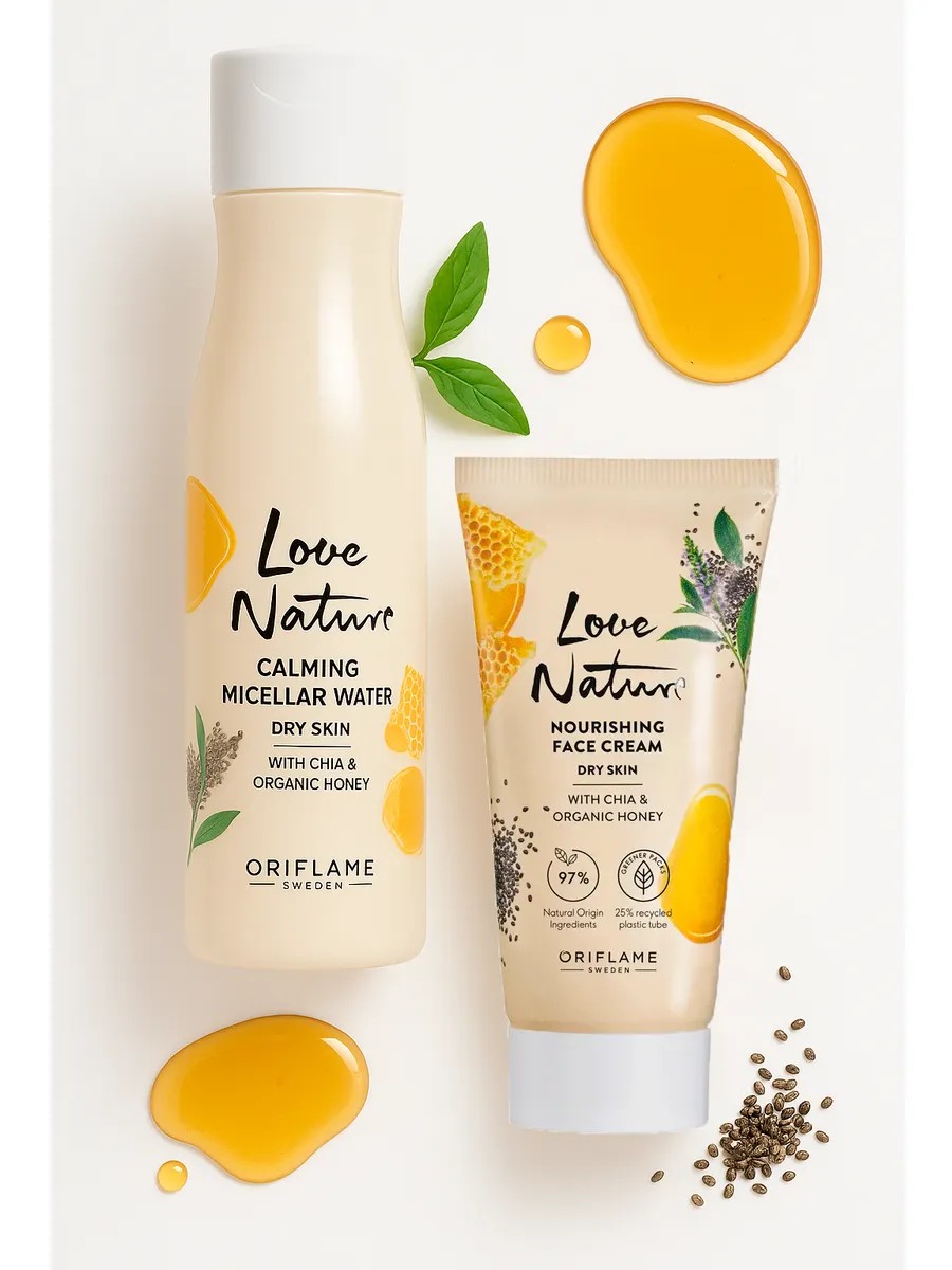 Dive into a world of natural skincare with the Love Nature set: Soothing Micellar Water with Chia and Organic Honey (150 ml) and Nourishing Face Cream with Chia and Organic Honey (50 ml).