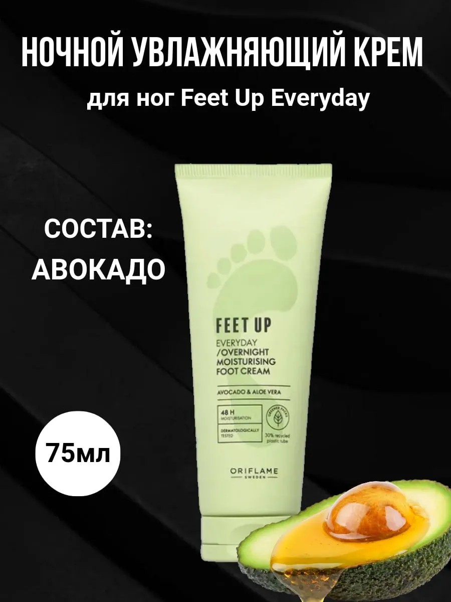 Ночной увлажняющий крем для ног Feet Up Everyday от Oriflame создан для глубокого увлажнения и восстановления кожи стоп во время сна. Формула включает экстракты авокадо и алоэ вера, которые помогают смягчить даже огрубевшие участки и успокаивают уставшую кожу. Крем легко впитывается, не оставляя жирных следов, и при регулярном использовании делает кожу более мягкой и гладкой. Он особенно полезен для тех, кто сталкивается с проблемой сухости и трещин на стопах