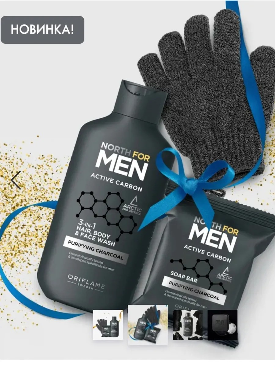 | Package Contents | Shower, hair and face wash 3 in 1 North for Men Active Carbon 250 ml; Soap North for Men Active Carbon 75 g; Massage glove with activated carbon. |
