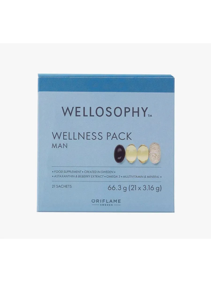 Wellness Pack содержит широкий спектр нутриентов в индивидуальных ежедневных саше, которыми вы можете легко наслаждаться дома или в дороге. Каждый саше содержит: 1 таблетку с мультивитаминами («Мультивитамины и минералы» для мужчин); 2 капсулы Омега-3 («Омега-3»); 1 капсулу с антиоксидантами («Астаксантин и экстракт черники»). «Мультивитамины и минералы» для мужчин «Мультивитамины и минералы» для мужчин от Oriflame содержат комплекс из 22 основных витаминов и минералов, который разработан для удовлетворения уникальных потребностей мужчин в питании. При регулярном приёме в сочетании со сбалансированной диетой он обеспечивает организм основными нутриентами для поддержания общего самочувствия. Витамины C и D, а также минералы цинк и железо способствуют нормальному функционированию иммунной системы. Богат витаминами A, D, E, C, B1, B2, B3, B5, B6, B7, B12, фолиевой кислотой. Богат железом, цинком, медью, марганцем, селеном, йодом, хромом и молибденом. Источник кальция и магния. «Омега-3» «Омега-3» от Oriflame производится из рыбьего жира, полученного из устойчивых рыбных источников, сертифицированных организацией Friend of the Sea. Необходимые жирные длинноцепочечные кислоты Омега-3 эйкозапентаеновая кислота (EPA) и докозагексаеновая кислота (DHA) являются жизненно важными частями всех клеточных мембран в организме и играют важную роль в организме, включая поддержание нормальной функции сердца*, зрения** и мозга**. *Позитивный эффект наблюдается при ежедневном приёме 250 г EPA- и DHA-кислот. **Позитивный эффект наблюдается при ежедневном приёме 250 г DHA-кислоты. «Астаксантин и экстракт черники» «Астаксантин и экстракт черники» от Oriflame представляет собой комбинацию антиоксидантов, которые включают натуральный астаксантин и экстракт черники. Кроме того, комплекс содержит витамины С и Е, которые способствуют защите клеток от окислительного стр