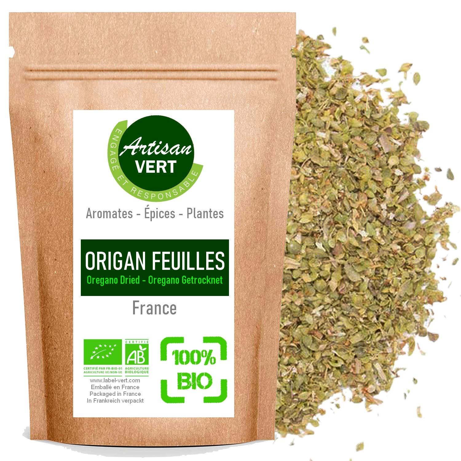 : Oregano, or common oregano (Origanum vulgare), is a perennial herbaceous plant species in the mint family (Lamiaceae), also known as wild marjoram or perennial marjoram. Oregano is sometimes confused with marjoram (Origanum majorana), or "garden oregano," with which it shares several characteristics, notably its medicinal and aromatic properties. Ingredients: OreganoPrepared and packaged in France, resealable bag. This product is prepared and packaged in our workshop in France for each order to preserve its freshness and aroma. It will enhance and add a special touch to your stews, omelets, soups, potato salads, lentil dishes, and more. Oregano can be used as is simply sprinkle it on to taste. Like most herbs, it doesn't tolerate prolonged cooking, so add it at the end of cooking or, ideally, just before serving. Oregano, less commonly used in France than marjoram (or garden oregano), has the same culinary and medicinal uses (antiseptic, antispasmodic, used since the Middle Ages), and the two plants are often confused. The flowering tops and leaves are used fresh or, failing that, dried, as a condiment or to flavor white wines.Description du produit L'Origan ou Origan commun (Origanum vulgare) est une espèce de plantes herbacées vivace de la famille des Lamiacées, également nommée, entre autres, Marjolaine sauvage ou Marjolaine vivace. L'origan est parfois confondu avec la Marjolaine (Origanum majorana) ou « origan des jardins », dont il partage plusieurs caractéristiques, notamment ses vertus médicinales et aromatiques. Ingrédients ORIGANPréparé et conditionné en France, Sachet Refermable. Produit préparé et conditionné dans notre atelier en France à chaque commande pour conserver toute la fraicheur et les arômes. Il agrémentera et donnera une touche toute particulière à vos ragoûts, omelettes, soupes et potages, salades à base de pomme de terre, plats de lentilles. L'origan s'utilise tel quel, il suffit d'en saupoudrer selon vos goûts. Comme la plupart des aromates, il n'aime pas les cuissons trop longues, donc privilégiez un ajout en fin de cuisson ou, idéalement, juste avant de servir. L'origan, moins utilisé en France que la marjolaine (ou origan des jardins), a les mêmes usages condimentaires et médicinaux (antiseptique, antispasmodique employé dès le Moyen Âge) et les deux plantes sont souvent confondues. Les sommités fleuries et les feuilles sont utilisées fraîches ou, à défaut, séchées, comme condiment ou pour aromatiser des vins blancs15.Origan en feuilles séchées 100g - L'Artisan du Vert,100 végétale, naturelle,