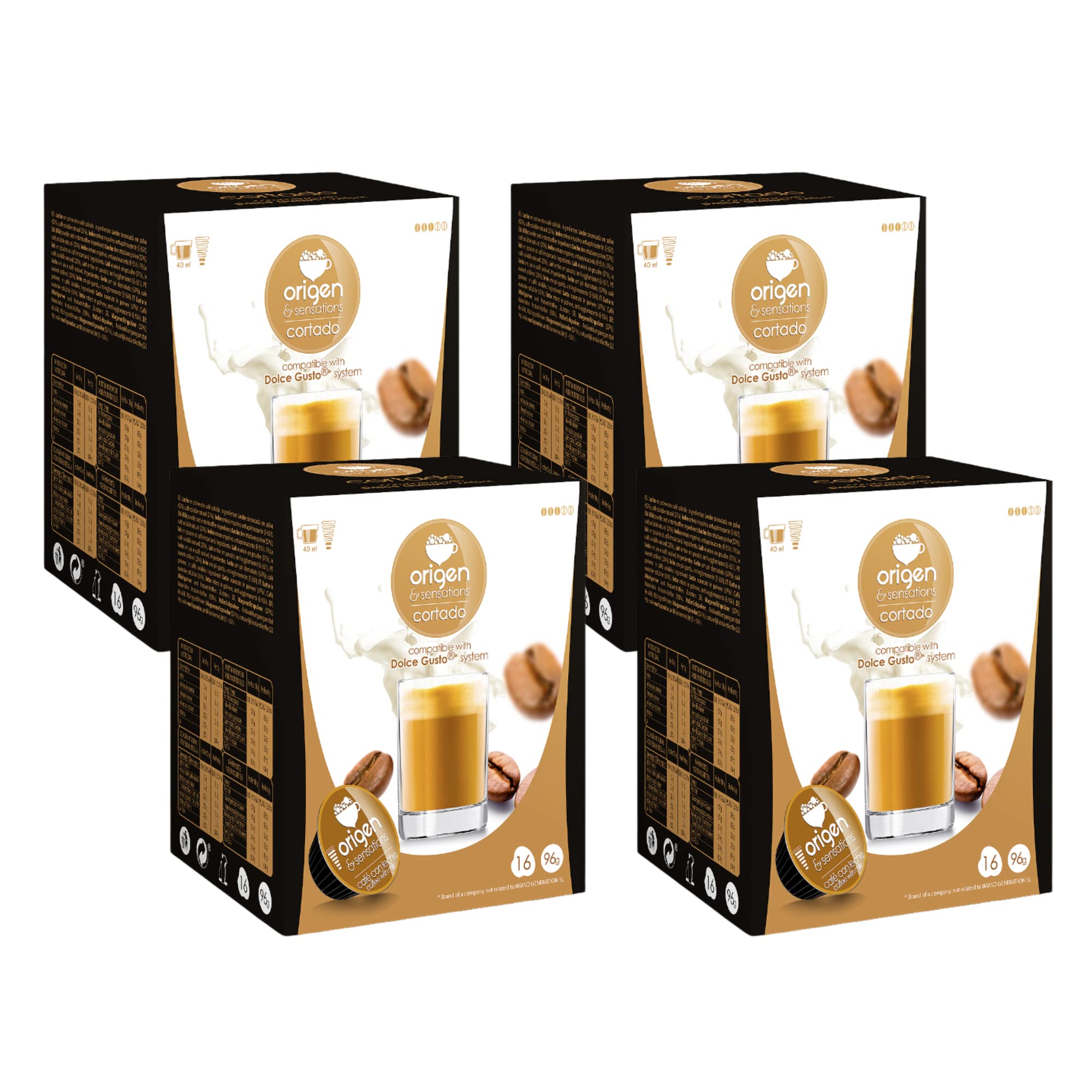 64 Dolce Gusto compatible capsules from Cut to prepare 64 drinks. Brand: Origen Sensations INSTRUCTIONS FOR USE Compatible with Dolce Gusto system machines SAFETY WARNING May contain traces of soy. Store in a cool, dry place. See more