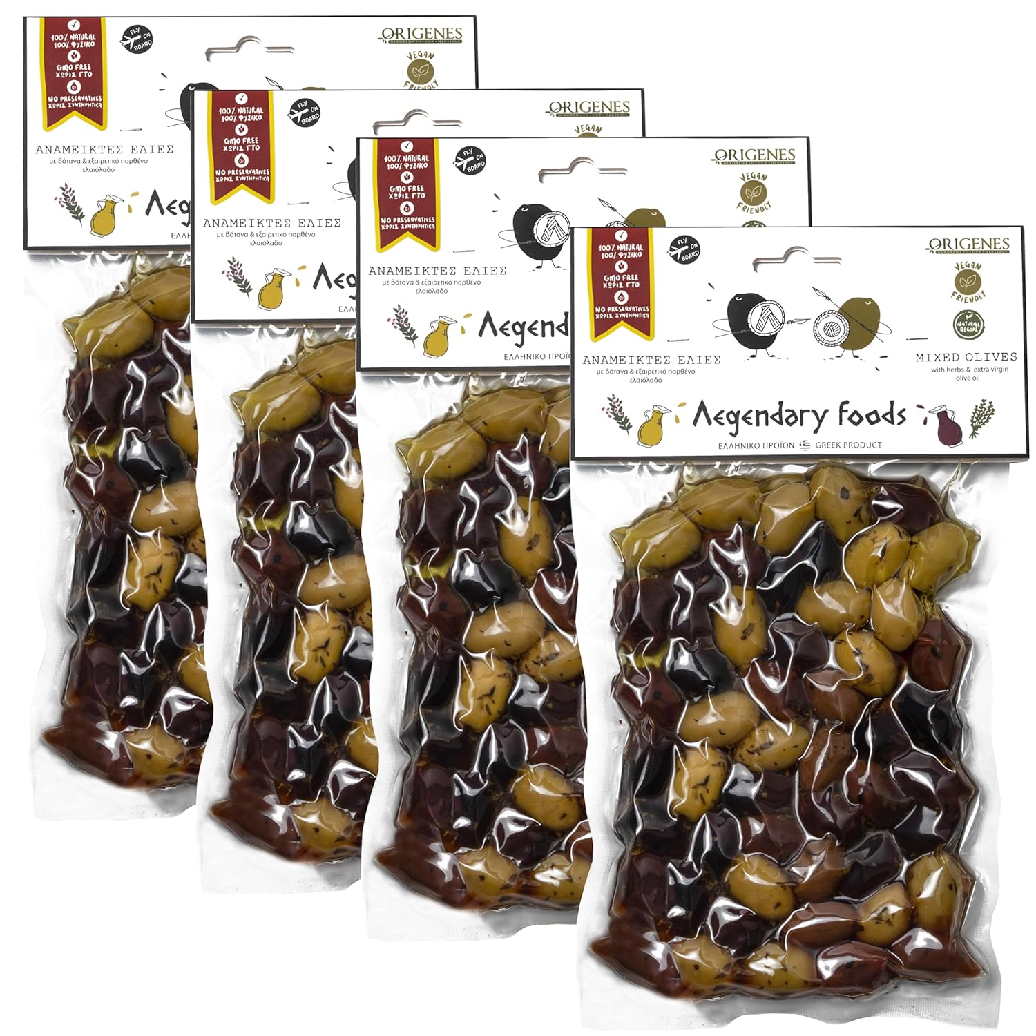 ORIGENES DEVOTED TO OUR HERITAGE Freshly Sealed Olives with Extra Virgin Oil Black Kalamon Olives mixed with Green Olives Marinated in Lemon juice - Mixed Olives in Vacuum - Pack Of 4