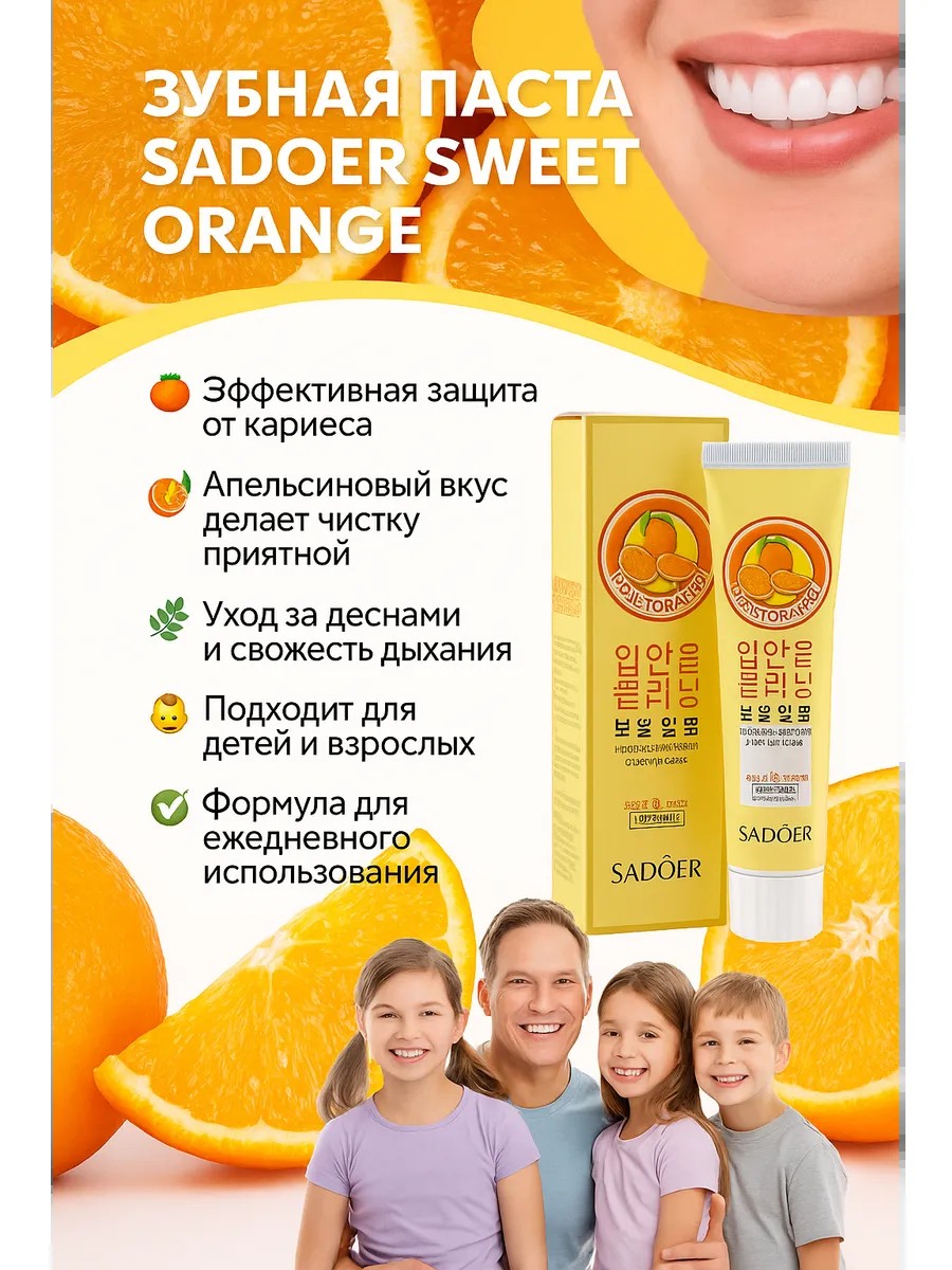 SADOER Sweet Orange toothpaste offers delicious and beneficial protection for teeth and gums with a juicy orange aroma.