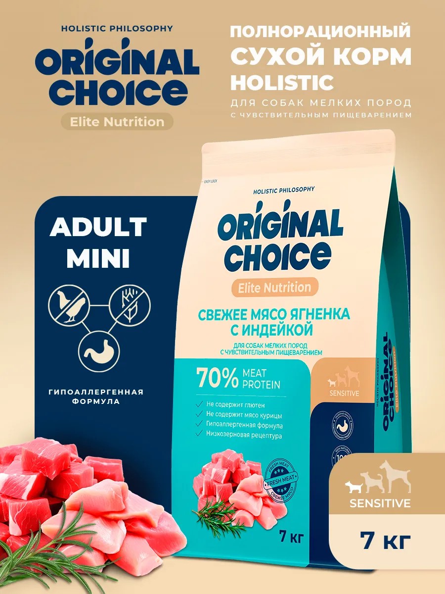 | Полное наименование товара | ORIGINAL CHOICE Adult Mini Sensitive Digestion полнорационный сухой корм для собак мелких пород с чувствительным пищеварением со свежим мясом ягненка и с индейкой, 7кг |