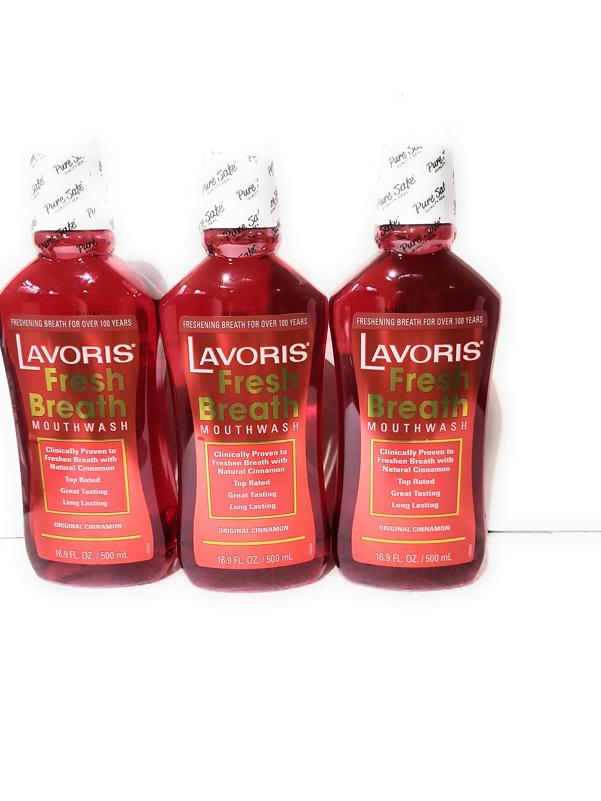 Original Cinnamon Lavoris Fresh Breath Mouthwash - 3 Pack of 16.9 oz Bottles. Classic flavor loved by many.