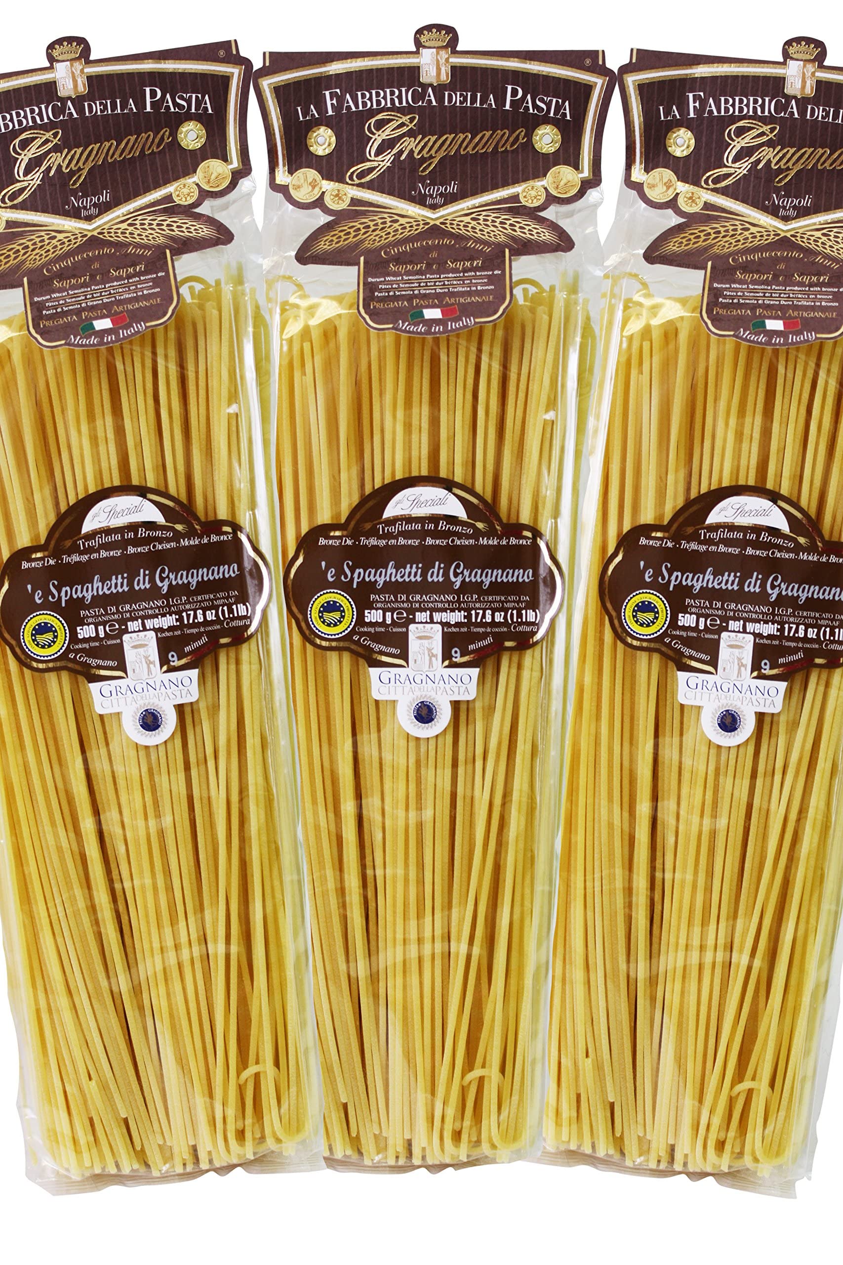 Transferer: La Fabbrica della Pasta di Gragnano S. A. S. di Antonino Moccia, Viale S. Francesco, 30, 80054 Gragnano Na, Italy Ingredients: durum wheat gries, spring water from Gragnano Contains gluten Nutritional value Pasta per 100 g condensing 1486kj / 350 kcal fat 1 g of which saturated fatty acids 0.3 g of carbohydrates 73 g of which sugar 2.5 g egg whites 13 g salt 0 g afterwards, and this is as important for a high -quality Italian pasta asThe good ingredients, it is slowly and gently dried at low temperatures.This spaghetti get their slightly roughened surface thanks to the ""Trafilata in Bronzo"", that is, by pressing the dough through bronze tubes.This enables the pasta to be able to absorb the sauce particularly well.The special thing about this high -quality pasta is that the ingredients from Italy (exclusively Italian durum wheat gries and water from the thousand -year -old source in Gragnano!), With a lot of time, passion and experience are put together to come together to come into this unique product. Inverkehrbringer: La Fabbrica della Pasta di Gragnano S. A. S. di Antonino Moccia, Viale S. Francesco, 30, 80054 Gragnano NA, Italien Zutaten: Hartweizengries, Quellwasser aus Gragnano Enthält Gluten Nährwerteangabe Pasta pro 100 g Brennwert 1486kJ / 350 kcal Fett 1 g davon gesättigte Fettsäuren 0,3 g Kohlenhydrate 73 g davon Zucker 2,5 g Eiweiß 13 g Salz 0 gAnschließend, und das ist für eine hochwertige italienische Pasta ebenso wichtig wie die guten Zutaten, wird sie langsam und sanft bei niedrigen Temperaturen getrocknet. Ihre leicht aufgeraute Oberfläche erhalten diese Spaghetti dank der „Trafilata in Bronzo“, also durch Pressen des Teigs durch Bronzerohre. Dies ermöglicht, dass die Nudeln die Soße besonders gut aufnehmen können. Das Besondere an dieser hochwertigen Pasta ist, dass die zu 100% aus Italien stammenden Zutaten (ausschließlich italienischer Hartweizengries und Wasser der tausendjährigen Quelle in Gragnano!), mit viel Zeit, Leidenschaft und Erfahrung handwerklich zu diesem einmaligen Produkt zusammengefügt werden.Original italienische Pasta Spaghetti di Gragnano IGP Angebot 3X500g