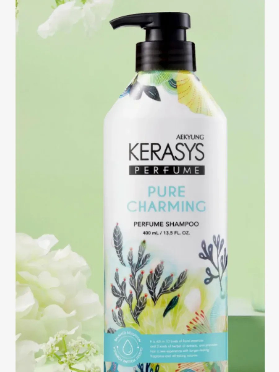 Perfumed shampoo for dry hair Kerasys Perfumed Line Pure & Charming Shampoo, thanks to panthenol, organic extracts of white lily and gardenia, nourishes hair, eliminates brittleness and dryness.