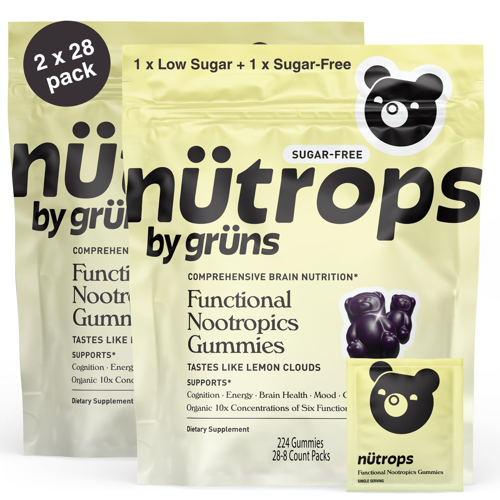 Comprehensive Nutrition for Brain Health: Gruns Nutrops are formulated with six types of mushrooms to support overall cognitive health. These refreshing Lemon flavored gummies are designed to enhance focus, Cognitive support, promote mental clarity, support Memory, and tackle the afternoon slump. Pair Nutrops with our Supergreens Gummy Bears for a total of 12g of dietary fiber for complete support.Formulated to Fit Your Life: At Gruns, we believe that foundational nutrition should be simple and convenient for everyone. We're dedicated to bringing comprehensive and complete nutrition to you through our gummies, formulated with whole-food ingredients. No Cutting Corners: Nutrops gummies are non-GMO, vegan, gluten-free, nut-free, dairy-free, and caffeine-free. Made without artificial colors or flavors, they are available in low-sugar and sugar-free options. No Mess, No Stress: Nutrops is thoughtfully formulated to be a delicious and seamless addition to your daily routine with our convenient snack packs, perfect for travel or on-the-go schedules. Each pack contains 8 tasty low-sugar gummy bears with only 9g of natural cane sugar. It's best to take first thing in the morning to power your day or in the afternoon for a focus pick-me-up. 10,000mg Mushroom Blend: Nütrops feature Lion's Mane, Cordyceps, Reishi, Maitake, Chaga, and Coriolus, each carefully selected for their unique properties - this is 5x more concentrated than any mushroom coffee, powder or pill. This blend is designed to support cognitive function, energy, brain health, mood, sleep, and gut health. Each pack contains a 10:1 concentrated dose of bioactive nutrients to help provide maximum potency and absorption. Comprehensive Nutrition for Brain Health: Gruns Nutrops are formulated with six types of mushrooms to support overall cognitive health. These refreshing Lemon flavored gummies are designed to enhance focus, Cognitive support, promote mental clarity, support Memory, and tackle the afternoon slump. Pair Nutrops with our Supergreens Gummy Bears for a total of 12g of dietary prebiotic fiber for complete support.