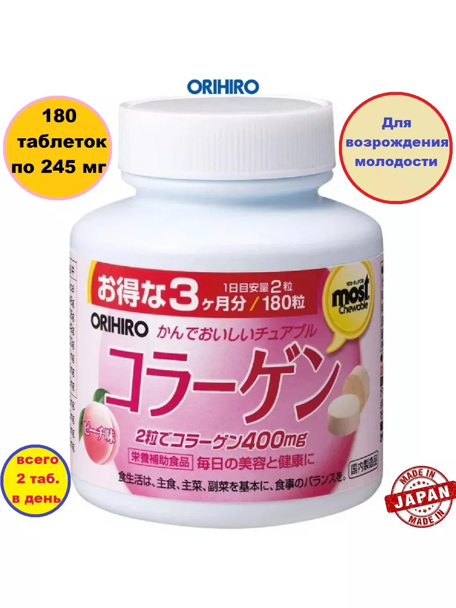 ORIHIRO Японский жевательный коллаген в таблетках с приятным вкусом персика Этот современный биологически активный добавка имеет комплексное действие и стимулирует красоту и молодость кожи изнутри. Постепенно он укрепляет костную систему, поддерживает суставы и, главное, улучшает упругость и тонус кожи. В то время как кремы и маски для лица действуют снаружи, коллаген ОРИХИРО со вкусом персика оказывает более сильное воздействие изнутри.