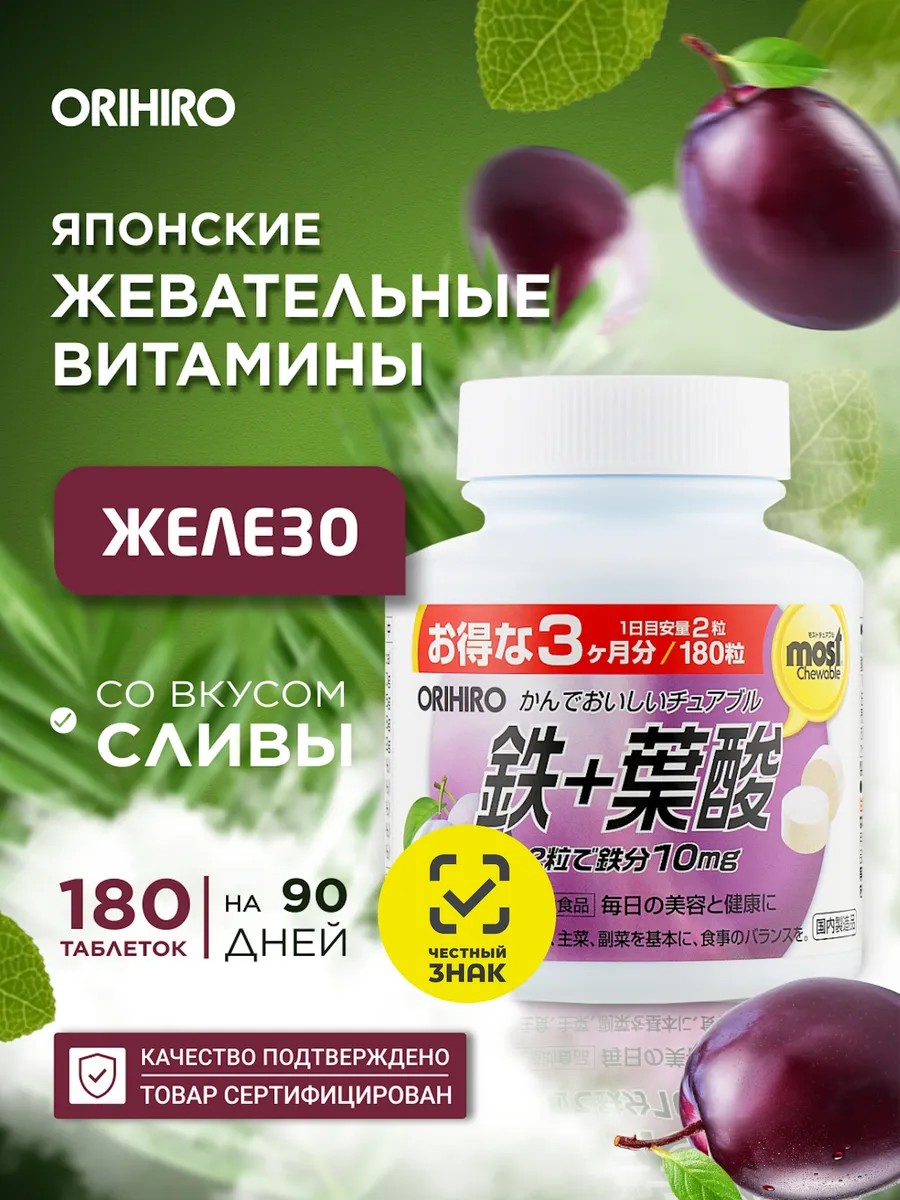 Комплекс жевательных витаминов для детей и взрослых ORIHIRO MOST Железо + Витамины группы В - жевательные конфеты со вкусом сливы, 180 таблеток на 90 дней.
