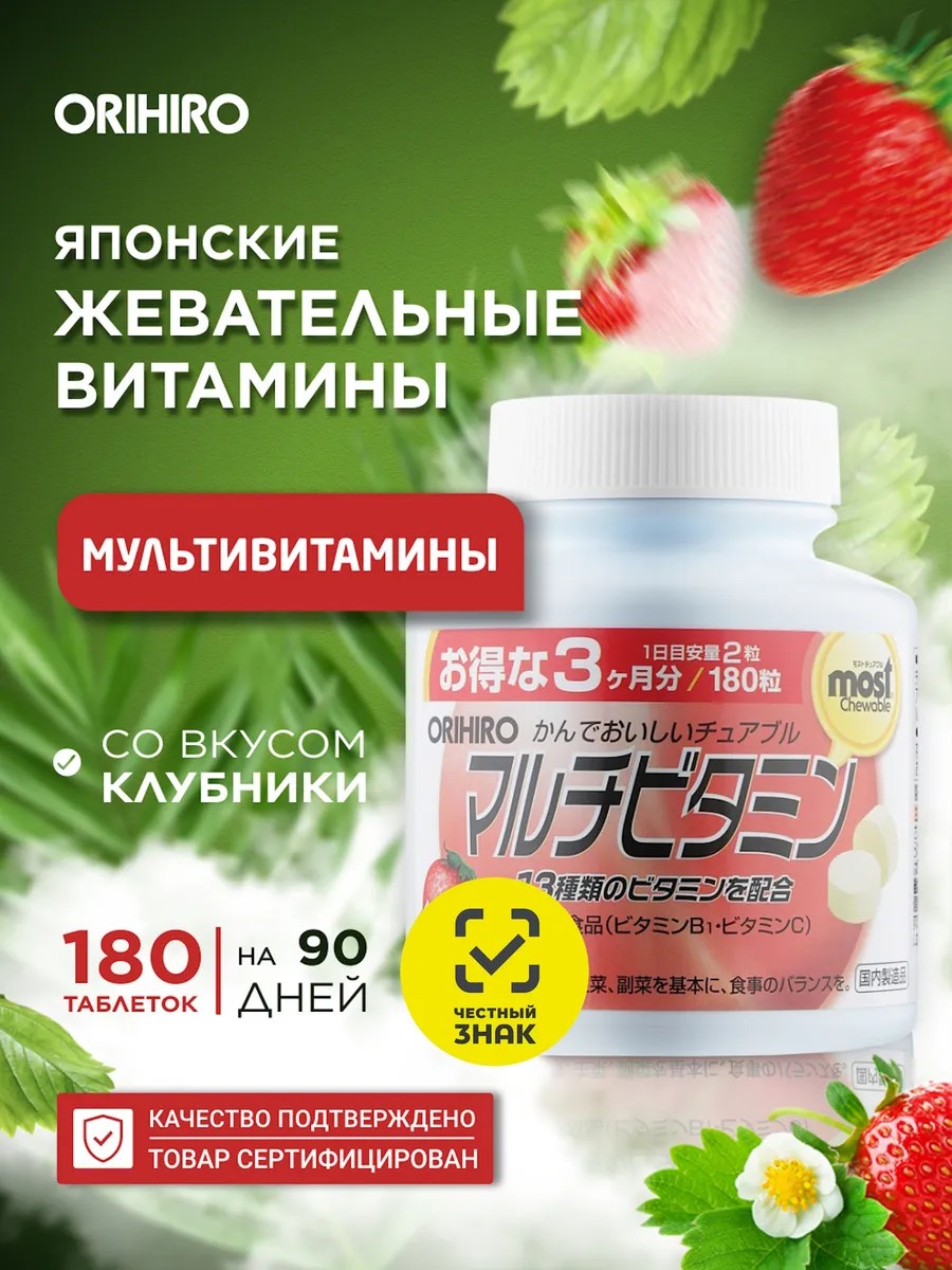 Японский комплекс витаминов для детей и взрослых ORIHIRO MOST мультивитамины со вкусом клубники, 180 штук на 90 дней.