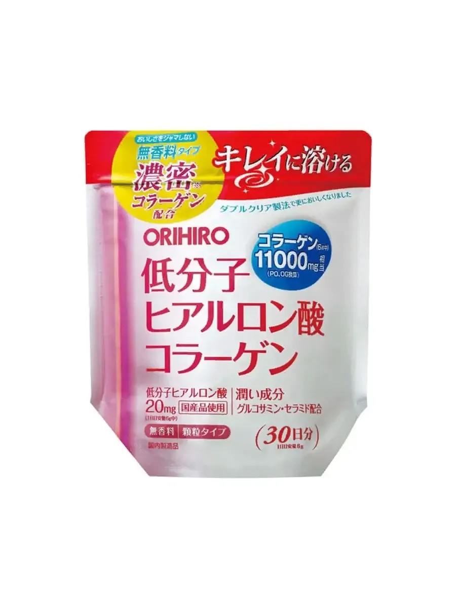 Orihiro Collagen Plus Hyaluronic Acid 180g for 30 Days. This Japanese vitamin contains: Dense Collagen. Collagen promotes: Improved skin condition – collagen fibers influence its strength. Thanks to them, the skin gains elasticity, hydration, and a toned appearance. Collagen accelerates tissue regeneration in wounds, scratches, and burns. A deficiency can lead to loss of elasticity, dryness, and thinning of the skin. Strengthens bones – collagen prevents their destruction. Improves heart function – collagen's beneficial properties also include its ability to prevent heart disease. It is one of the most important elements in the formation of arterial walls. Its deficiency leads to the destruction of the arteries responsible for transporting blood to the internal organs. Strengthens nails and hair – collagen makes the nail plate smooth and even, and hair smooth, shiny, and free of split ends. Low molecular weight hyaluronic acid. Its purpose is to regulate the formation of enzymes responsible for the skin barrier's function at a deep level. Glucosamine is a monosaccharide produced by joint cartilage. Collagen peptides stimulate the synthesis of the skin's own collagen. The dietary supplement's action is aimed at the following vital mechanisms: improving skin turgor by retaining moisture in the deep layers and producing the skin's own collagen; slowing the aging process; normalizing muscle tissue nutrition and improving blood flow; improving the functioning of connective tissues in the body: cartilage, tendons, etc. Directions for use: You can dissolve the preparation in any liquid or simply drink it with water. Take 6 grams per day (1 heaping teaspoon) 20-30 minutes before meals, dissolving in liquid or with water. Ingredients per 6g of product: collagen peptide derived from pig and cow raw materials (contains gelatin, made in Japan), dextrin, sugar cane extract, ceramide-containing rice extract/glucosamine (obtained from shrimp and crab), hyaluronic acid. Main ingredients: collagen peptide 5000mg (dense collagen 4.2% used/percent collagen) [Collagen 11,000mg equivalent/PO, OG conversion], low molecular weight hyaluronic acid 20mg, glucosamine 100mg, ceramide 200mcg. Energy value per 6g of product: 23 kcal - 5.8g proteins, 0g fats, 0-0.55 carbohydrates, 0-0.1 salt equivalent.