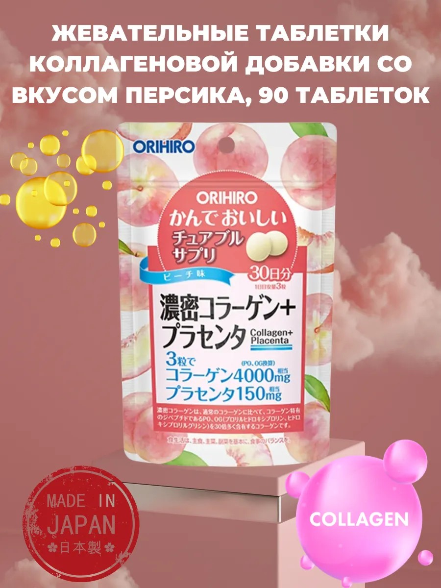 Orihiro Коллагеновые жевательные таблетки со вкусом персика, 90 таблеток
