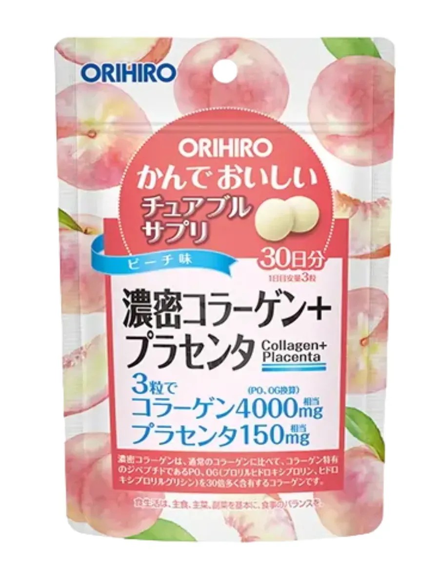 Orihiro Rich Collagen Peach Flavored Chewable Tablets (90 Tablets) Orihiro Rich Collagen chewable tablets are ideal for maintaining beauty and health. They contain a high concentration of collagen and placenta, which have a positive effect on the skin and help slow the aging process. Collagen plays a key role in maintaining skin firmness and elasticity, helping fight signs of aging such as wrinkles and dryness. It also promotes joint and ligament health, maintaining their strength and flexibility. Placenta is rich in amino acids, vitamins, and other biologically active substances that promote cell regeneration and improve overall skin tone. It also supports the immune system and improves overall health. These tablets provide the body with valuable nutrients. Peach flavor. Directions: Take 3 tablets daily, chewing. Ingredients: sugar, maltose, fish collagen peptide (including gelatin), peach powder, porcine placenta extract powder, crystalline cellulose, sucrose fatty acid ester, acidifier, flavoring, sweetener (aspartame/L-phenylalanine compound, sucralose, acesulfame K), vitamin B2. Active ingredient content (3 tablets): collagen peptide 135 mg (equivalent to 4000 mg collagen/PO, OG), placenta extract 3 mg (equivalent to 150 mg placenta).