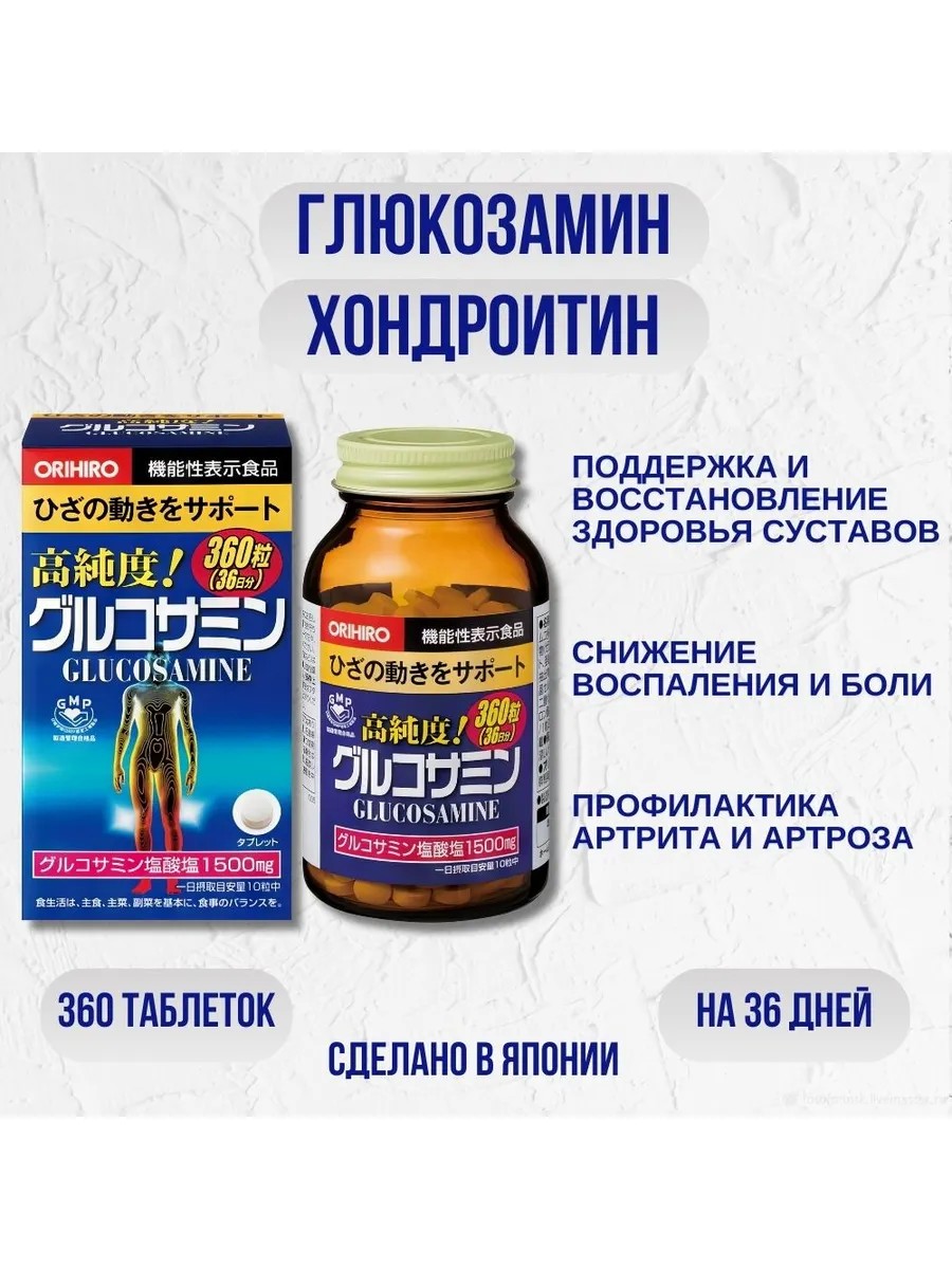 Витаминный комплекс для поддержки здоровья суставов - это специальная формула, разработанная Orihiro. Она включает в себя все необходимые элементы, такие как глюкозамин, хондроитин и гиалуроновую кислоту, для поддержания здоровья ваших суставов. Этот хондропротектор - настоящий помощник для тех, кто заботится о своих суставах и желает сохранять их молодость и гибкость. Глюкозамин и хондроитин, основные компоненты этого продукта, работают вместе, чтобы обеспечить достаточную питательную поддержку вашим суставам. Глюкозамин стимулирует регенерацию хрящевой ткани и укрепляет соединительные ткани вокруг суставов. Хондроитин действует как «масло» для вашего суставного яблока: он оберегает его от трения и увеличивает его эластичность. Глюкозамин быстро снимает боли в суставах, уменьшает отечность, воспаление и напряжение в пораженных местах, и при этом не имеет побочных эффектов. В молодом возрасте потребность в глюкозамине обычно удовлетворяет сам организм, синтезируя это вещество в должных количествах. С возрастом синтез глюкозамина снижается, что приводит к возникновению проблем с суставами. Регулярное применение глюкозамина позволяет восстановить подвижность суставов, увеличить двигательную активность и повысить качество жизни при наличии заболеваний опорно-двигательного аппарата. Глюкозамин принимает участие во многих внутренних процессах организма: стимулирует выработку гиалуроновой кислоты синовинальной (межсуставной) жидкости; восстанавливает обменные процессы в клетках; уменьшает воспалительные процессы; повышает проницаемость суставной капсулы; обеспечивает подвижность суставов; уменьшает болевой синдром; тормозит разрушение и изменения в хряще.