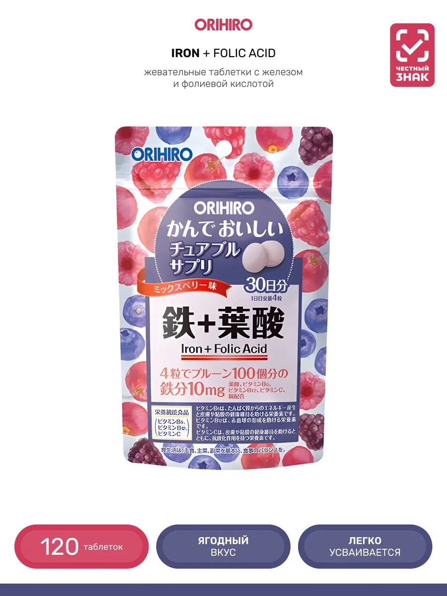 The ORIHIRO dietary supplement in the form of chewable tablets contains iron, folic acid, B vitamins, and vitamin C.