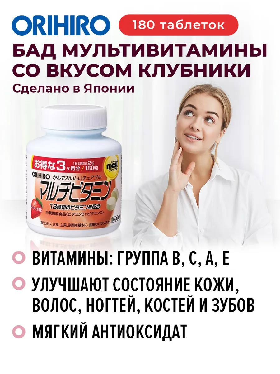 БАД «Мультивитамины со вкусом клубники» от японского бренда ORIHIRO — это оптимально сбалансированный витаминно-минеральный комплекс в виде небольших жевательных таблеток со вкусом клубники для поддержания сил, красоты и здоровья. Витамины и минералы помогут вам сохранять активность в течение всего года, улучшат настроение и состояние кожи, укрепят волосы и ногти, избавят от проблем авитаминоза, поддержат иммунную систему! Добавка отличается отличной усвояемостью организмом и тщательно подобранной дозировкой. Можно для всей семьи! Вашим детям точно понравится форма в виде жевательных конфеток с приятным вкусом.