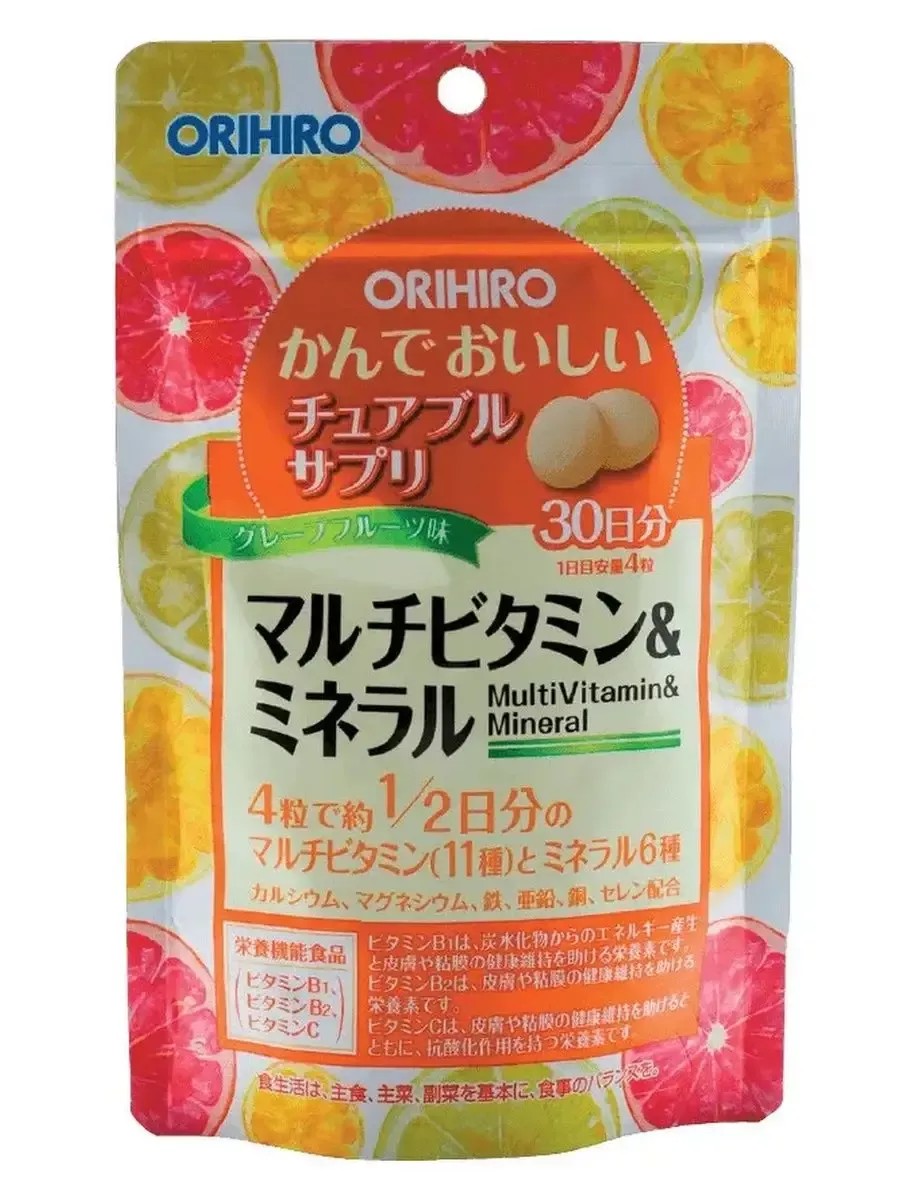 | Комплектация | Orihiro Жевательные мультивитамины и минералы со вкусом вкус тропических фруктов 120 таблеток. |