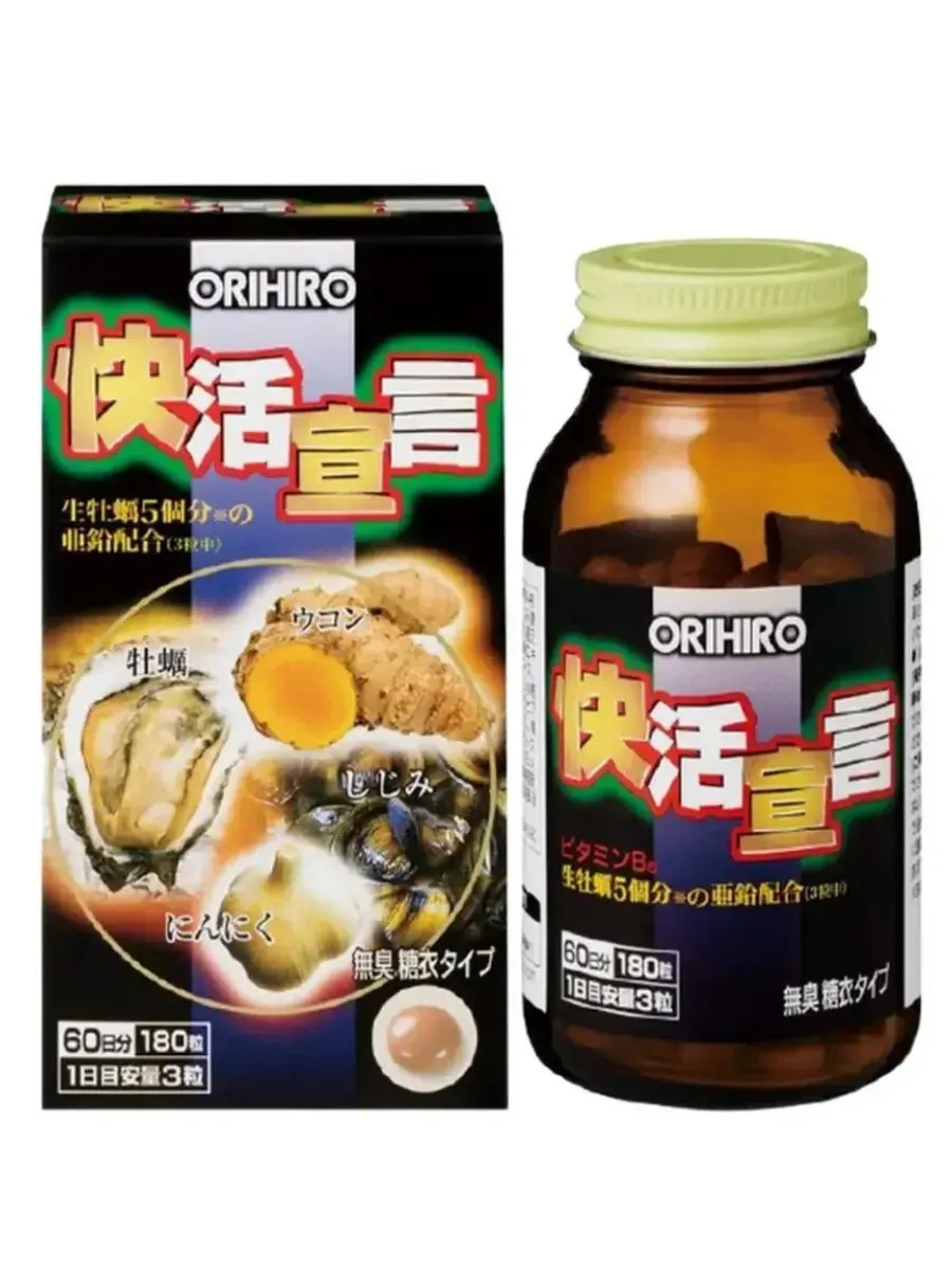 ORIHIRO Multi-Complex with Curcumin, Oyster Extract, and Amino Acids (180 capsules). This multi-complex from the Japanese company ORIHIRO is recommended for the active functioning of the entire male body. Thanks to its high concentration of natural ingredients, it regulates the function of organs and systems, improves brain activity, stabilizes the nervous system, and enhances potency. Features of ORIHIRO Dietary Supplement: Multivitamins with curcumin, oyster extract, and amino acids: a source of dopamine, which increases libido, stimulates the production of the male sex hormone testosterone, increases sperm count, boosts testosterone production, enhances male potency, improves heart, thyroid, immune system, brain, liver, and vision function, normalizes blood cholesterol levels, prevents atherosclerosis, coronary heart disease, heart attack, and stroke, cleanses the body of toxins and waste, prevents prostatitis, increases stress resistance, normalizes blood pressure, has a beneficial effect on blood vessels and improves blood composition, reduces the risk of cancer, helps restore sexual function in men, improves erectile function, has a beneficial effect on the entire body, and prevents prostate diseases (prostatitis). Together, these natural ingredients work harmoniously, effectively, and in a balanced manner. As a result, a person is filled with strength and energy for work, rest, and love. Directions: Take 3 capsules daily with meals. Swallow with cold or warm water. Ingredients: 3 capsules: oyster extract, mussel extract, turmeric, garlic, vitamin A, vitamin D, niacin, folic acid, zinc, iron, selenium.