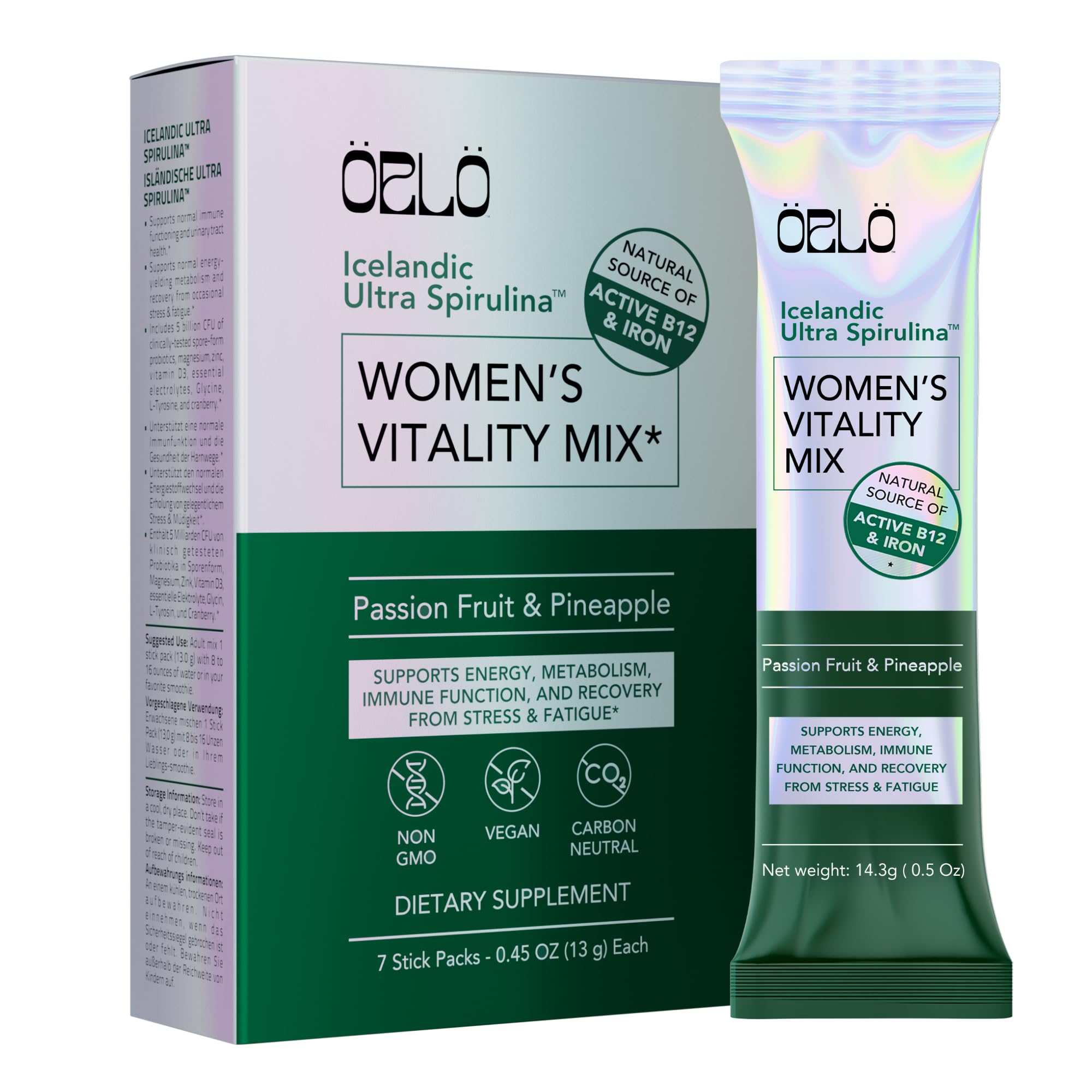 VEGAN AND CARBON-NEGATIVE: At Örlö, our vision is clean and nutrient-rich daily nutrition. Our algae is cultivated in Iceland using 100 geothermal energy and pristine waters, resulting in the world's purest carbon-negative Spirulina. Grown indoors with Örlö technology, it's pesticide-free, oxalate-free, and third-party tested. ICELANDIC ULTRA SPIRULINA: Örlö's unique Icelandic Spirulina is cultivated using a patented process, resulting in abundant bioactive Vitamin B12 in Methylcobalamin form and easily absorbable, bioavailable heme iron, along with all nine essential amino acids and over 50 vitamins, minerals, and micronutrients. A genuine superfood for your brain and body. TARGETED PROBIOTIC CRANBERRY: Women's Vitality Mix includes clinically studied probiotic strain DE111 (Bacillus subtilis) alongside antioxidant-rich cranberry powder - ingredients recognized for supporting microbial balance and wellness in areas essential to women's health. This mix is a sophisticated addition to a daily self-care ritual. MENTAL FOCUS RESILIENCE ON THE GO: Formulated with L-Tyrosine, an amino acid known for its role in neurotransmitter synthesis, this blend supports mental clarity, concentration, and performance. Whether you're navigating busy days, multitasking, or managing high demands, this formula is designed to help you stay clear, composed, and resilient. PREMIUM DAILY MULTIVITAMIN FOR WOMEN: Formulated with high-integrity ingredients and cutting-edge spirulina innovation, this premium supplement delivers targeted support for digestion, normal energy metabolism, feminine balance, mental performance, and bone health - for women in every age and every chapter of life. In refreshing PINEAPPLE PASSION FRUIT TWIST flavour.
