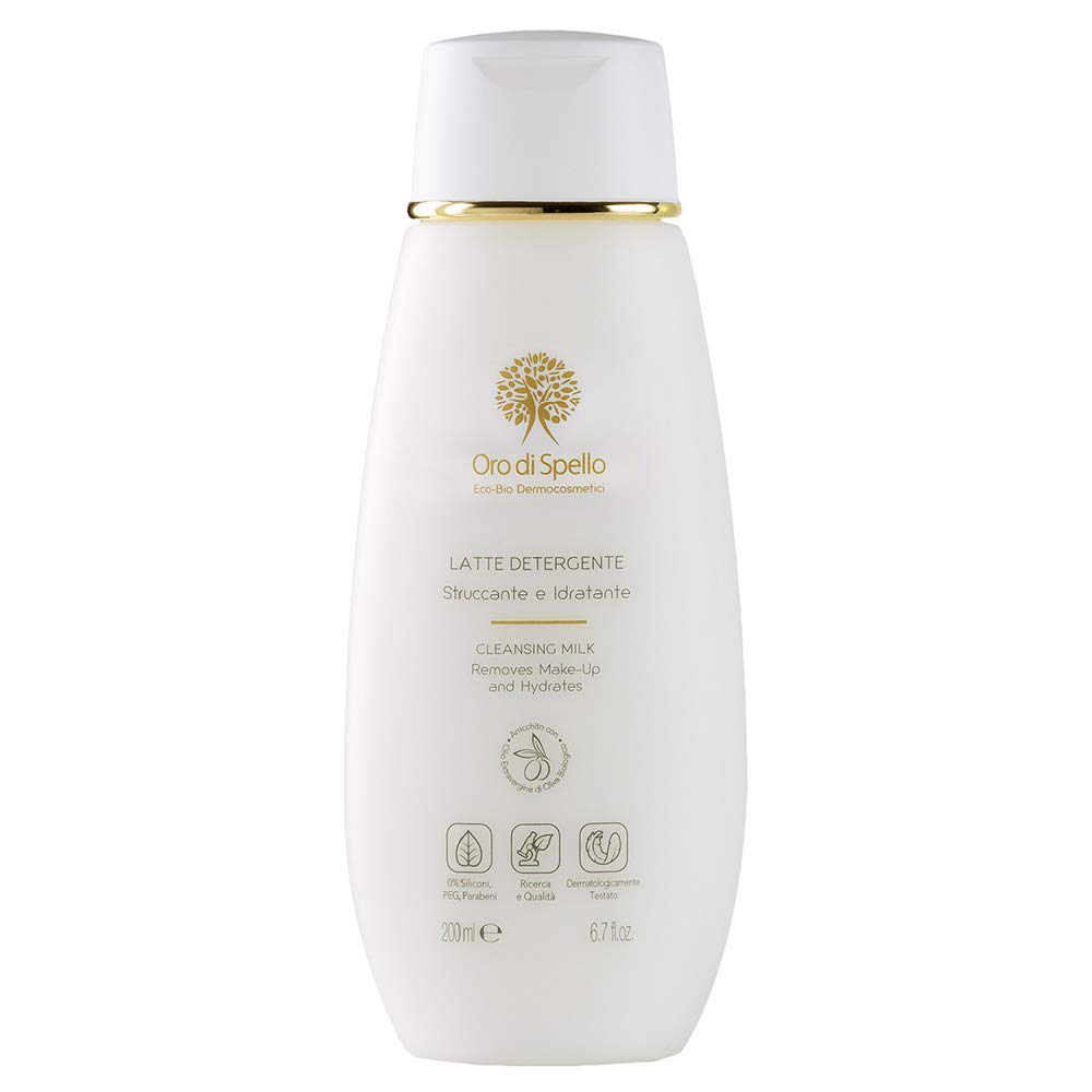 Oro de Spello olive oil, produced by Frantoo de Spello, comes from one of the most characteristic olive varieties in the region. It is a complete line of organic dermo-cosmetic products, enriched each year with new insights, thanks to creativity and new technologies. Scientific research has shown that olive oil has a natural fat composition very similar to the skin's sebum. It therefore has the best affinity for the skin's lipid layer . It has the ability to significantly slow down skin aging by providing exfoliating and moisturizing action. The active ingredients in our products are exquisite organic plant-based ingredients from our region and extra-virgin olive oil from the world-renowned spice, but it is thanks to science that our exclusive formulas are created using cutting-edge technologies and produced after rigorous quality testing. All Oro de Spello products are dermatologically tested. Cleansing Cosmetics: The gentle formulas with organic extra virgin olive oil, enriched with natural extracts with softening and moisturizing properties such as calendula, green tea leaves, and sweet almond oil, are ideal for daily face and body cleansing. Why choose Gold Leaf Cleansing Milk? Gold Leaf Cleansing Milk is free of harsh surfactants and contains valuable antioxidant, nourishing, and protective ingredients such as organic olive oil, vitamin-rich and natural camellia oil, particularly nourishing seed oil, and elasticizing organic sweet almond oil. Certificate of Conformity Reg. EC 834 2007 verified by CCPB Srl protocol IT BIO 009 CX DG 09195 15 12 201How to apply: Massage with a cotton pad or sponge, using circular motions from the center of the face outwards, and rinse with lukewarm water. When to use: Ideal for gently removing makeup and cleansing the skin at any time of day. Dermatologically tested, with organic ingredients, free of silicone, petrolatum, and parabens. Ingredients: Enriched with organic extra virgin olive oil and sweet almond oil, it provides nourishment and hydration, leaving skin soft. Description: With its creamy texture, it gently cleanses the face, removing impurities and makeup. Free of harsh surfactants, it respects the skin and is suitable for all skin types.Oro di Spello, Lait Viso Nettoyant Bio, Démaquillant et Hydratant, 1 boîte de 200 mlDESCRIPTION DU PRODUIT L'huile d'or d'éple, produite par le Frantoo d'épaule, provient de l'une des cultivaires les plus caractéristiques du territoire de l'enfant. C'est une ligne complète de produits écologiques dermocosmétiques, qui s'enrichit chaque année de nouvelles intuitions, grâce à la créativité et aux nouvelles technologies. La recherche scientifique a démontré que l'huile d'olive a une composition en matières grasses naturelles très similaire au sebe de la peau. Elle présente donc la meilleure affinité à la couche lipidique de la peau . Il a la capacité de ralentir de manière significative le vieillissement cutané en effectuant une action éolliante et hydratante. Les principes actifs de nos produits sont de très belles ingrédients végétaux biologiques de notre territoire et de l'huile extra-vierge d'olive d'épice célèbre dans le monde entier, mais c'est grâce à la science que nos formules exclusives sont réalisées avec des technologies d'avant-garde et produites après des tests de qualité rigoureux. Tous les produits Oro de Spello sont testés dermatologiquement. Cosmétiques détergents : La délicatesse des formules à l'huile d'olive extraverge biologique enrichies avec des extraits naturels aux propriétés adoucissantes et hydratantes comme le calendul, les feuilles de thé vert et l'huile d'amande douce sont idéales pour le nettoyage quotidien du visage et du corps. Pourquoi choisir le lait nettoyant or de bord ? Le Lait Détergent Or d'épingle est exempt de tensioactifs agressifs pour la peau et contient de précieux ingrédients antioxydants, nutritifs et protecteurs tels que l'huile d'olive biologique du brise-bise d'épingle, l'huile de camélia, riche en vitamine et naturelle, l'huile de seame, particulièrement nutritive et d'huile d'amande douce bio, élastiante. Certificat de Conformité Reg.CE 834 2007 contrôlé par CCPB Srl protocole IT BIO 009 CX DG 09195 15 12 201Comment l'appliquer : se masser avec un disque en coton ou avec des poupastreaux, en suivant des mouvements circulaires du centre du visage vers l'extérieur et se réglisse à l'eau tiède. Quand on utilise : idéal pour démaquiller et nettoyer la peau avec délicatesse à tout moment de la journée. Dermatoloptique, avec ingrédients d'agriculture Bio, sans silicone, pétrolates, parabènes. Ingrédients : enrichi avec huile d'olive extra vierge et huile d'amandes douces biologiques, apporte nutriment et hydratation et rend la douceur à l'épiderme. Description : de la texture crème, nettoie délicatement la peau du visage, en retirant les impuretés et le makeup. Sans tensioactifs agressifs respecte l'épiderme et est adapté à tous les types de peau.
