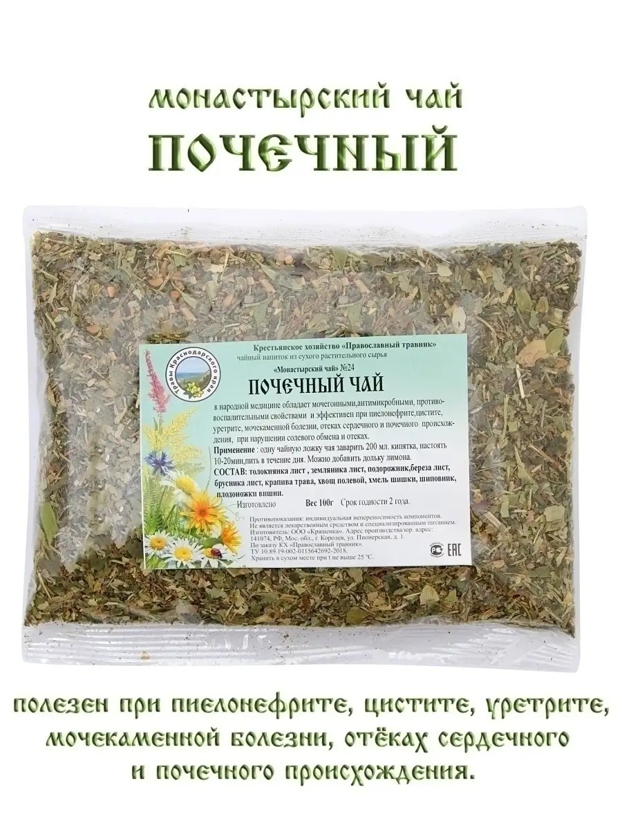 Монастырский чай травяной сбор № 24 Почечный 100 гр. КХ Православный травник. Сбор в народной медицине обладает мочегонными, антимикробными, противовоспалительными свойствами и эффективен при пиелонефрите, цистите, уретрите, мочекаменной болезни, отеках сердечного и почечного происхождения, нарушении солевого обмена.- Применение : одну чайную ложку чая заварить 200 мл. кипятка, настоять в течении 20 минут, пить в течение дня. Можно добавить дольку лимона.- Состав: толокнянка лист, земляника лист, подорожник, береза лист, брусника лист, крапива трава, хвощ полевой, хмель шишки, шиповник, плодоножки вишни.- Масса нетто: 100 грамм. Монастырский сбор для почек / Сбор трав Монастырский для почек / Почечный чай / Почечный сбор / Сбор для почек /
