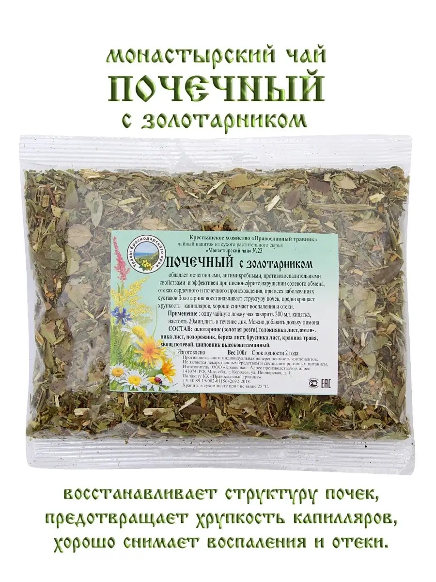 Монастырский чай травяной сбор № 23 Почечный с золотарником 100 гр. КХ Православный травник. Растения, входящие в состав чая, обладают мочегонными, антимикробными, противовоспалительными свойствами. Чай эффективен при пиелонефрите, нарушении солевого обмена, отеках сердечного и почечного происхождения, при всех заболеваниях суставов. Золотарник восстанавливает структуру почек, предотвращает хрупкость капилляров, хорошо снимает воспаления и отеки.- Применение: одну чайную ложку чая заварить на 200 мл кипятка, настоять в течении 20 минут. Пить в течении дня. Можно добавить дольку лимона.- Состав: золотарник (золотая розга), толокнянка лист, земляника лист, подорожник, береза лист, брусника лист, крапива трава, хвощ полевой, хмель шишки, шиповник высоковитаминный, плодоножки вишни.- Масса нетто: 100 грамм. Монастырский сбор для почек / Сбор трав Монастырский для почек / Почечный чай / Почечный сбор / Сбор для почек /