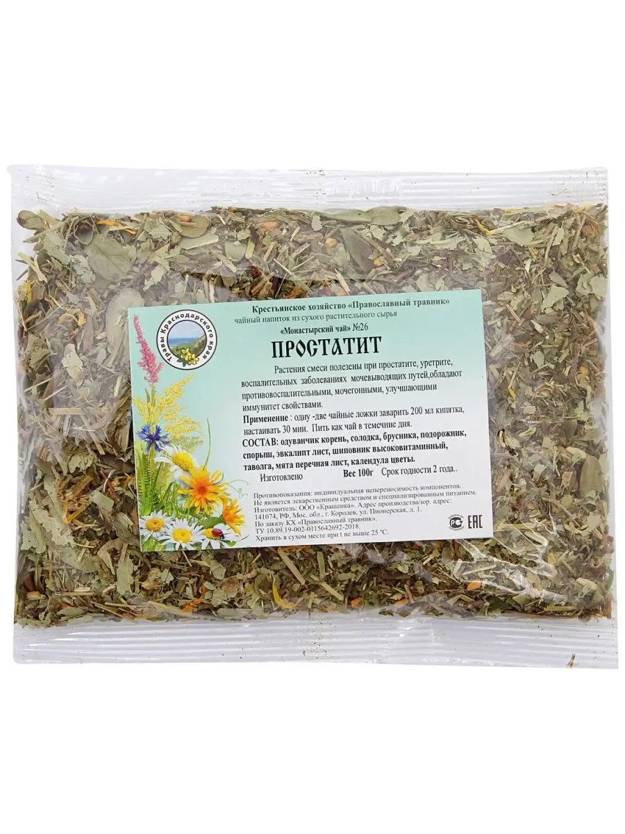 Монастырский чай травяной сбор № 26 Простатит 100 гр. КХ Православный травник. Растения чая полезны при простатите, уретрите, воспалительных заболеваниях мочевыводящих путей, обладают противовоспалительными, мочегонными, улучшающими иммунитет свойствами.- Рекомендуется чередовать с монастырским чаем Почечный.- Применение: одну чайную ложку заварить 200 мл. кипятка, настаивать 30 мин. и принимать по 1/3-1/4 стакана 3-4 раза в день.- Состав: одуванчик корень, солодка, брусника, подорожник, спорыш, эвкалипт лист, шиповник высоковитаминный, таволга, мята перечная лист, календула цветы.- Масса нетто: 100 грамм.