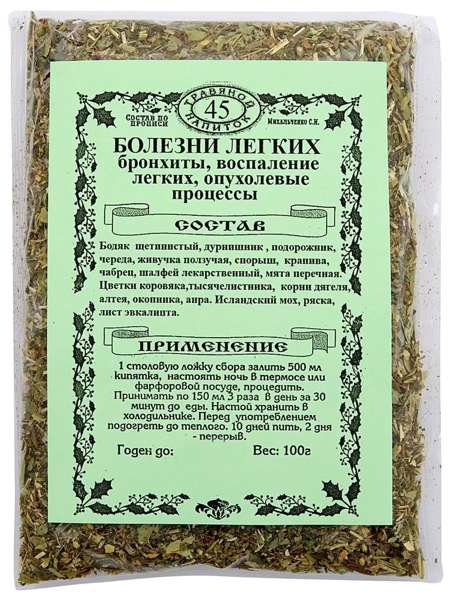 Травяной сбор эффективно справляется с серьезными заболеваниями легких. Он незаменим при опухолевых процессах и других затяжных недугах. Секрет эффективности препарата - четко выверенная рецептура, отличное качество компонентов, соблюдение технологии заготовки и приготовления сбора. В его состав входят травы, росшие в экологически чистых районах. На заготовку компонентов и изготовление сбора получено благословение монастырей. - Препарат способствует восстановлению эпителия, активизирует альвеолярные макрофаги, разжижает мокроту. Он оказывает обволакивающее и детоксикационное действие, повышает уровень гемоглобина. Эффективен как антисептическое и противогрибковое средство.- **Состав**: бодяк щетинистый, дурнишник, подорожник, череда, живучка ползучая, спорыш, крапива, чабрец, шалфей лекарственный, мята перечная, цветки коровяка, тысячелистника, корни дягеля, алтея, окопника, аира, исландский мох, ряска, лист эвкалипта.- Масса нетто: 100 грамм.