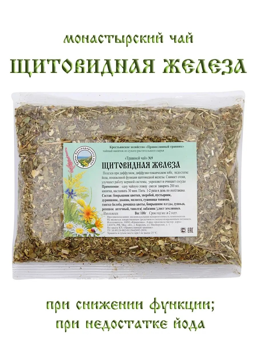 Монастырский чай травяной сбор №9 Щитовидная железа 100 гр. КХ Православный травник. Сборы трав по рецептам монахов широко известны своими лечебными свойствами и применяются при терапии многих заболеваний и патологий систем человеческого организма. Монастырский чай для щитовидной железы готовят из растений, которые положительно влияют на ее работу. Его применяют при следующих нарушениях работы щитовидки:- снижении функции щитовидной железы;- диффузном зобе;- недостатке йода;- диффузно-токсическом зобе. Чай снимает отеки, улучшает работу нервной системы, укрепляет и очищает сосуды.- Применение: одну чайную ложку смеси заварить 200 мл кипятка, настаивать 30 минут. Пить 1-2 раза в день по полстакана. - Состав: боярышник цветки, зверобой, пустырник, дурнишник, донник, мелисса, сушеница топяная, гингко билоба, ромашка цветы, боярышник плоды, душица, репешок аптечный, таволга( лабазник ), лист земляники.- Масса нетто: 100 грамм.