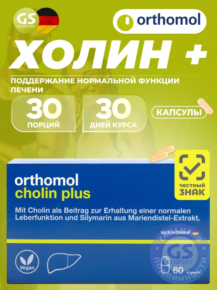 Годен до 30.01.2027. Антиоксиданты Cholin Plus 60 капсул. Orthomol Cholin Plus – здоровье печени и естественная защита организмаПечень – это главный щит организма, который не только вырабатывает желчь для расщепления жиров, но и связывает и выводит из организма различные токсины, ежедневно атакующие организм человека. И от того, насколько эффективно работает печень, во многом зависит самочувствие человека. Нарушение функции печени способствует развитию сердечно-сосудистых заболеваний, нарушениям обмена веществ. С возрастом и после тяжелых отравлений клетки печени не успевают регенерировать и ее функция нарушается.Избежать этого и восстановить здоровье и эффективную работу печени поможет биоактивный комплекс Orthomol Cholin Plus.Капсулы Orthomol Cholin Plus содержат:Холин – витамин В4, который нормализует обмен жиров, снижает уровень холестерина в крови, предотвращает образование камней в желчном пузыре, имеет успокаивающее и антидепрессивное воздействиеЭкстракт расторопши, который выводит из организма токсины, стимулирует восстановление клеток печени, имеет антиоксидантный эффект, защищает организм от отравлений.Не содержит глютена, лактозы и глюкозы.Применяется для: Восстановления печени и нормализации ее работы Профилактики желчекаменной болезни Снижения уровня холестерина в крови Устранения последствий отравлений и лечения антибиотиками Активизации иммунитета.Рекомендации по применениюПринимать во время приема пищи по 2 капсулы в сутки целиком, запивая достаточным количеством жидкости. При необходимости можно открыть и смешать содержимое с холодной или теплой водой, или напитками. Не следует превышать рекомендуемой суточной дозы.