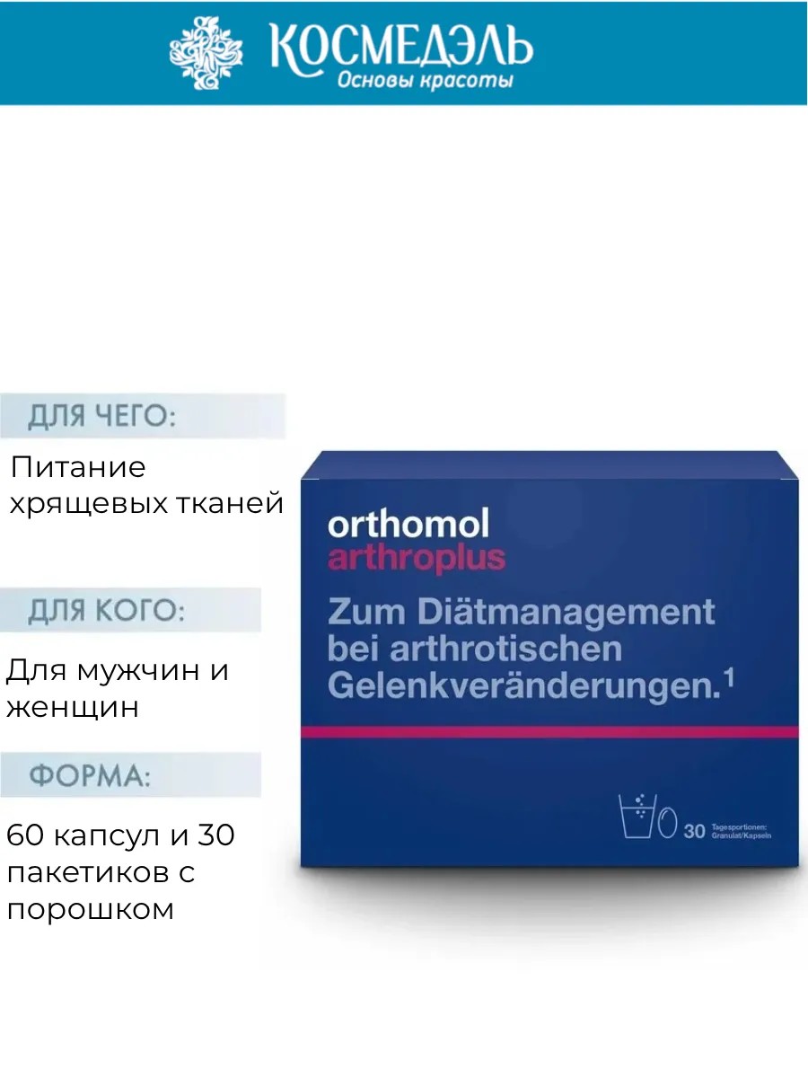 Как пациент с артрозом, вы слишком хорошо знаете симптомы: начальная боль или даже боль в суставах при каждом движении. Иногда сильнее, иногда слабее. Суставы очень чувствительны и поэтому также подвержены риску износа. В дополнение к упражнениям, питание является важным строительным блоком для здоровья суставов. Сустав представляет собой гибкое соединение между двумя костями. Чтобы две суставные поверхности не терлись друг о друга при каждом движении, они покрыты защитным гладким слоем хряща. Хрящевой матрикс состоит из различных веществ, таких как B. Глюкозамин и хондроитинсульфат, гиалуроновая кислота и коллаген могут накапливать воду и действовать как амортизатор. Однако, поскольку хрящ не может быть обновлен организмом, важно своевременно обеспечить суставы питательной поддержкой в сочетании с физическими упражнениями. В случае артритных заболеваний суставов требуется больше питательных микроэлементов, особенно питательных веществ, активных для хрящей и костей. Благодаря своим свойствам и характеристикам Orthomol arthroplus способен удовлетворить специфические потребности в питании суставов, вызванных артритом. Научные данные показывают, что комбинация сульфата глюкозамина, сульфата хондроитина, гидролизата коллагена, гиалуроновой кислоты и омега-3 жирных кислот, а также витаминов, минералов и других разнообразных ингредиентов соответствует потребностям в питании для диетического лечения суставных артритов. . В случае Orthomol arthroplus превышены максимальные количества витаминов С и Е и не достигнуты минимальные количества витамина К и минералов натрия, кальция, магния, меди и молибдена в соответствии с соответствующей целью. Порошок по 15 г, капсулы массой 750 мг