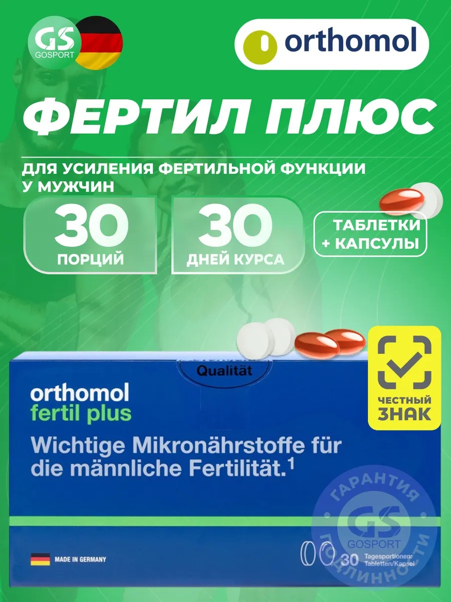 Годен до 28.02.2027. Витамины для мужчин Fertil plus (таблетки+капсулы) курс 30 дней. Orthomol Fertil plus (табл.+капс. 30 дн.) – ортомолекулярный препарат, разработанный специально для мужчин, планирующих зачатие ребенка. Микроэлементы, входящие в состав комплекса, позволяют улучшить состояние мужской репродуктивной системы, стимулировать сперматогенез. Форма выпуска: табл+капс – не требует растворения в жидкости, проста в применении, не имеет запаха, свойственного для минералов и аминокислот.Форма выпуска Orthomol Fertil plus: капсулы и таблетки.Срок годности 36 месяцевУпаковка Orthomol Fertil plus - капсулы + таблетки (30 дней): содержит 30 капсул и 90 таблеток (87 г).Рекомендация по применению Orthomol Fertil plus: витаминный комплекс нужно принимать каждый день по 3 таблетки и 1 капсуле (суточная порция). Прием осуществляется во время еды или после. Ежедневную порцию можно принимать как разово, так и в несколько заходов, распределяя препарат на несколько приемов пищи. Полностью восполнить нехватку питательных веществ, необходимых для восстановления мужской фертильности, можно при длительном и регулярном приеме препарата.Внимание!!! Рекомендуется начать прием витаминного комплекса Orthomol Fertil plus за 3 месяца до планируемой беременности. Более подробная информация в брошюре, представленной на данной странице.Важные указания: данный препарат не является полноценным продуктом питания. Прием Ортомол Фертил плюс возможен только после консультации либо под наблюдением врача.