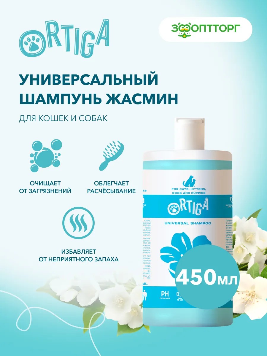 Ortiga's universal shampoo for puppies, dogs, kittens, and cats, with a jasmine scent, effectively removes dirt, facilitates combing, and helps eliminate odor.